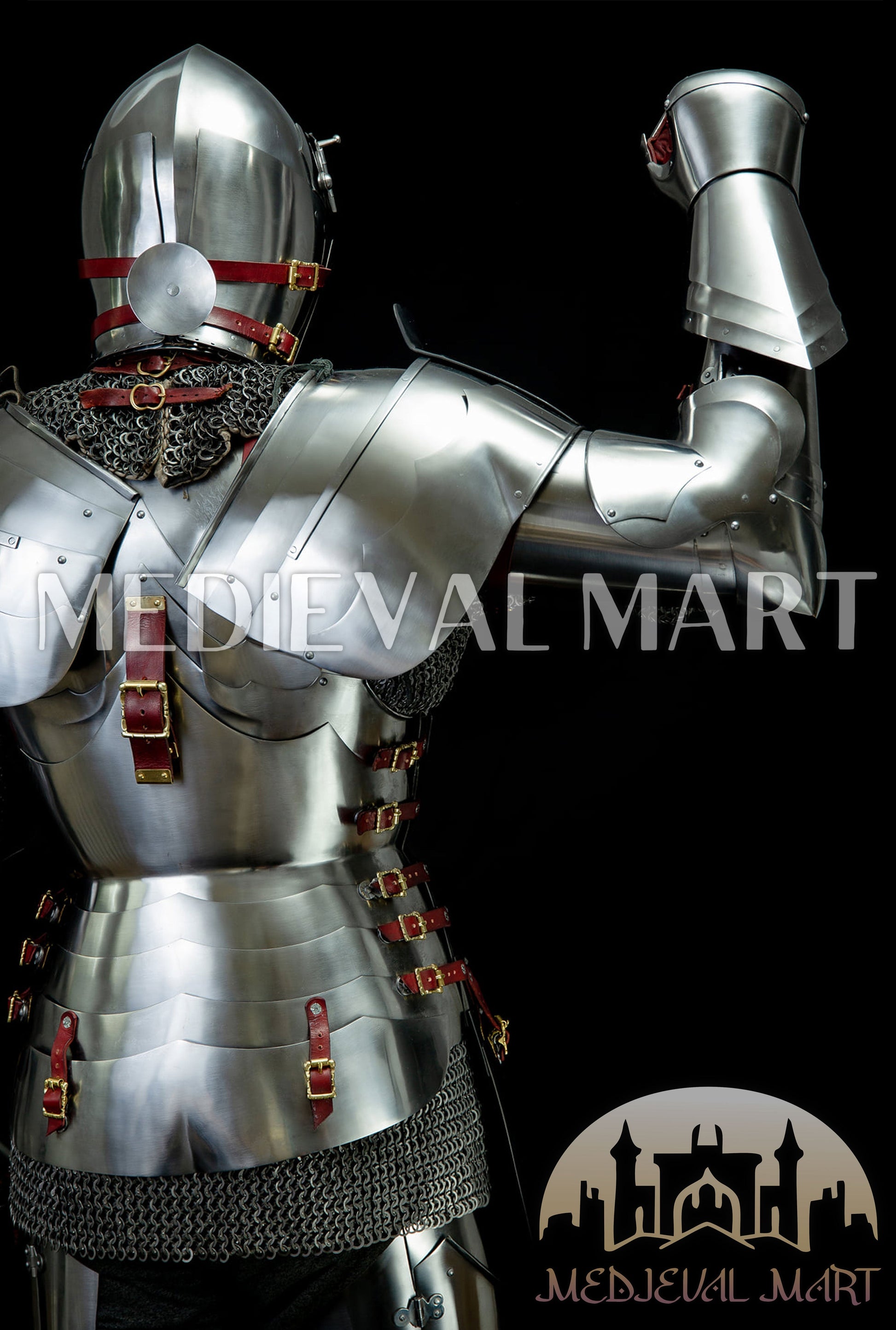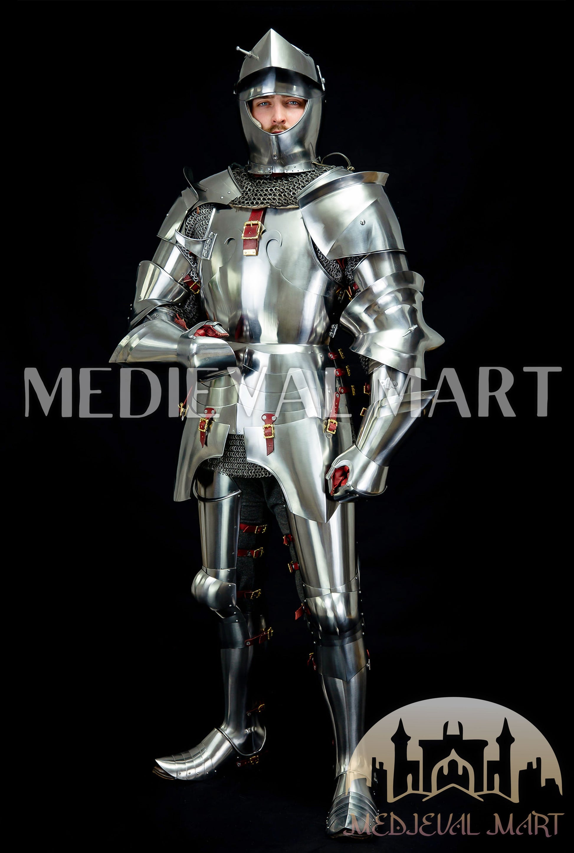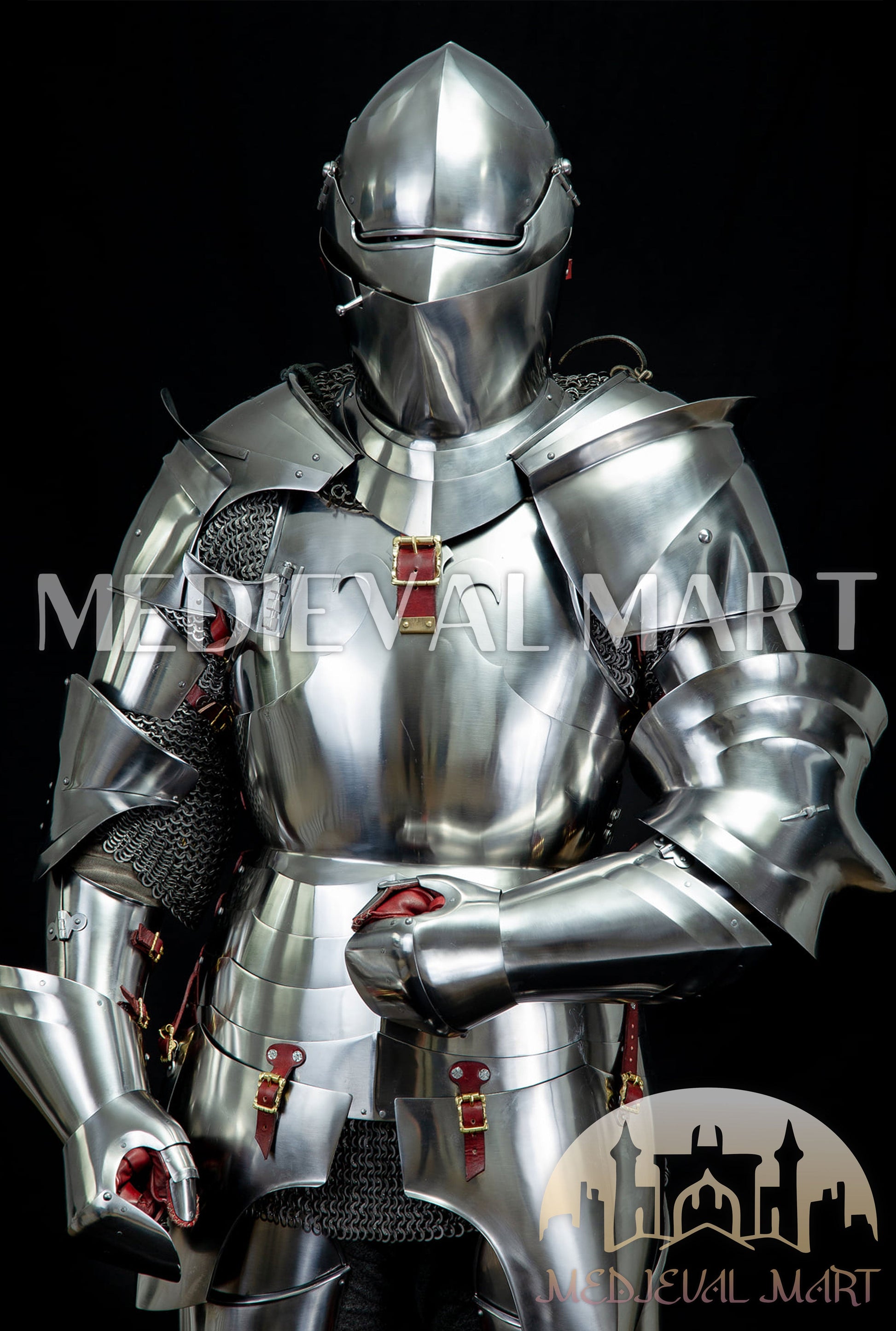 Enter the world of true medieval warfare with MEDIEVALMART’s 14th-Century European English Hardened Steel Plate Armor, featuring a sleek buff-polished finish and a historically accurate Houndskull closed bascinet helmet. Designed for serious reenactors, collectors, and performers, this armor replicates the battlefield protection worn by English knights during the Hundred Years’ War.