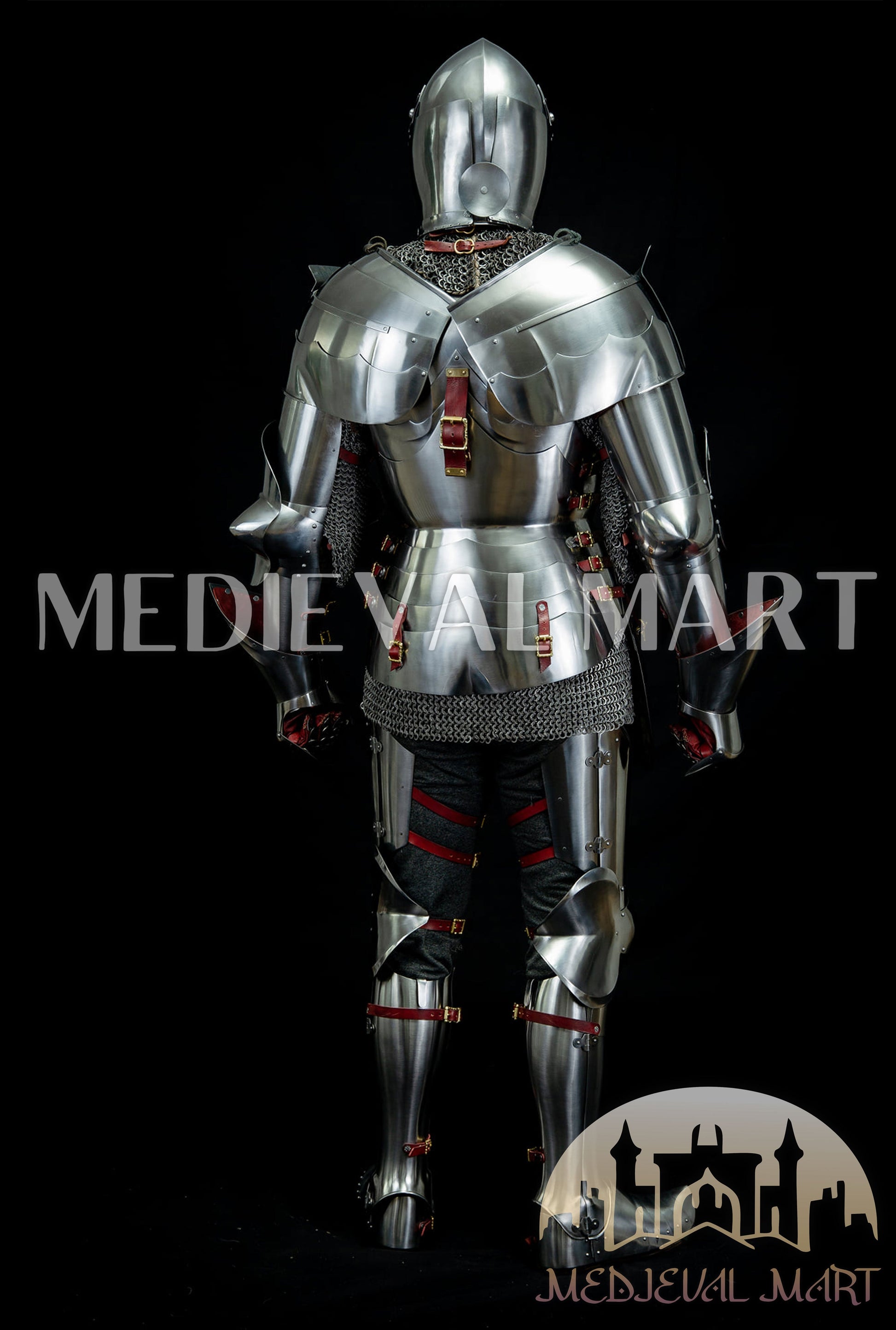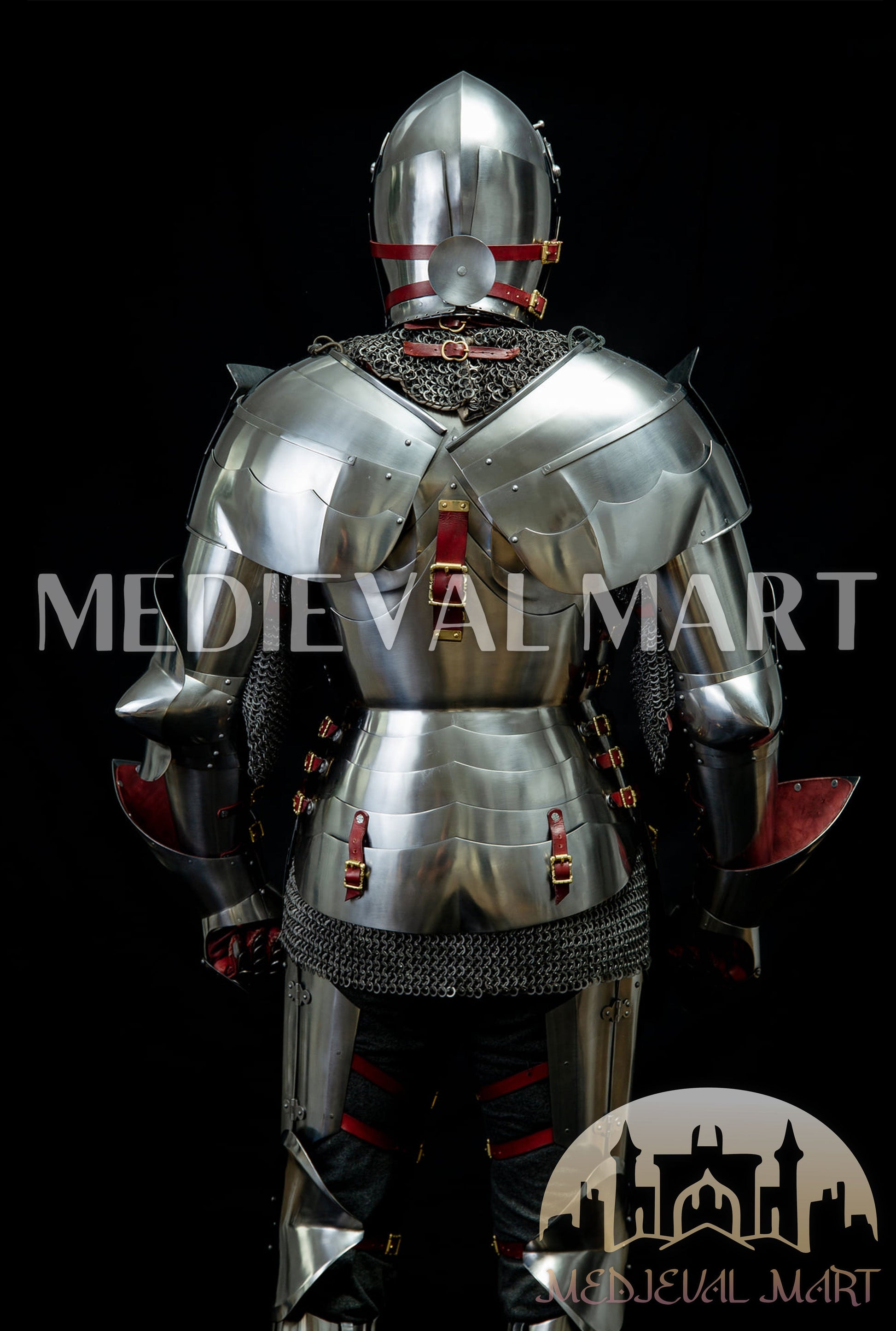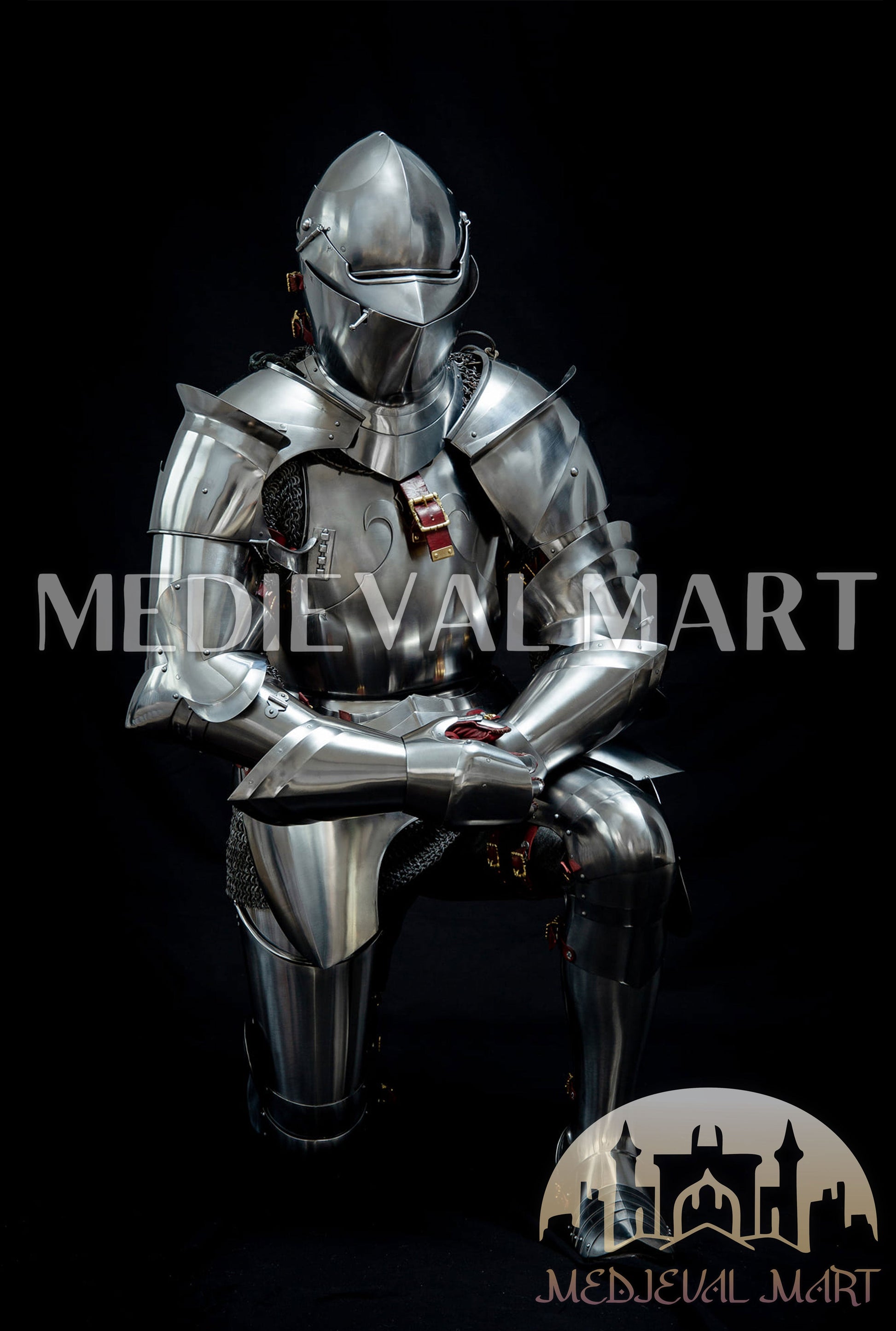 Enter the world of true medieval warfare with MEDIEVALMART’s 14th-Century European English Hardened Steel Plate Armor, featuring a sleek buff-polished finish and a historically accurate Houndskull closed bascinet helmet. Designed for serious reenactors, collectors, and performers, this armor replicates the battlefield protection worn by English knights during the Hundred Years’ War.