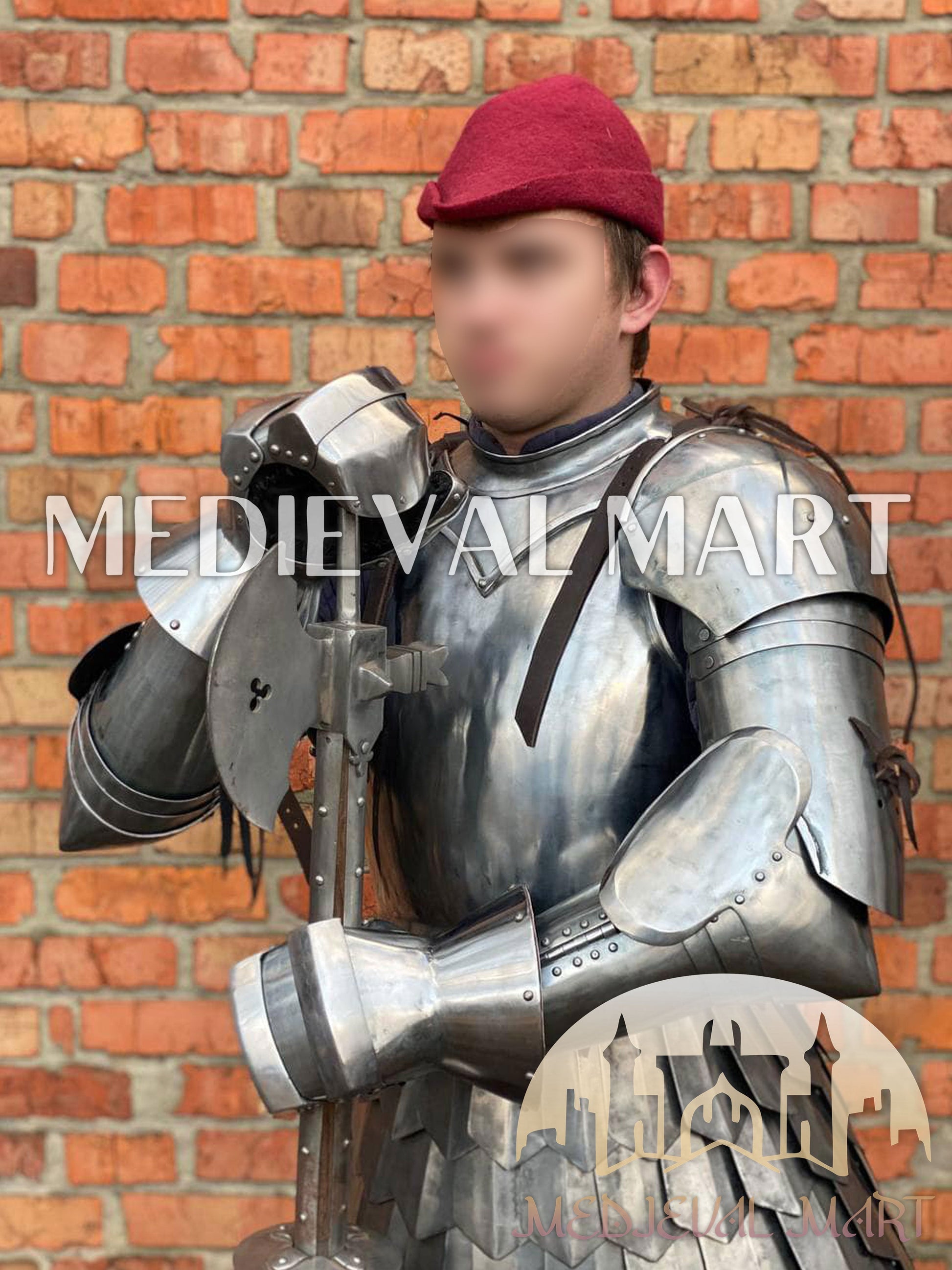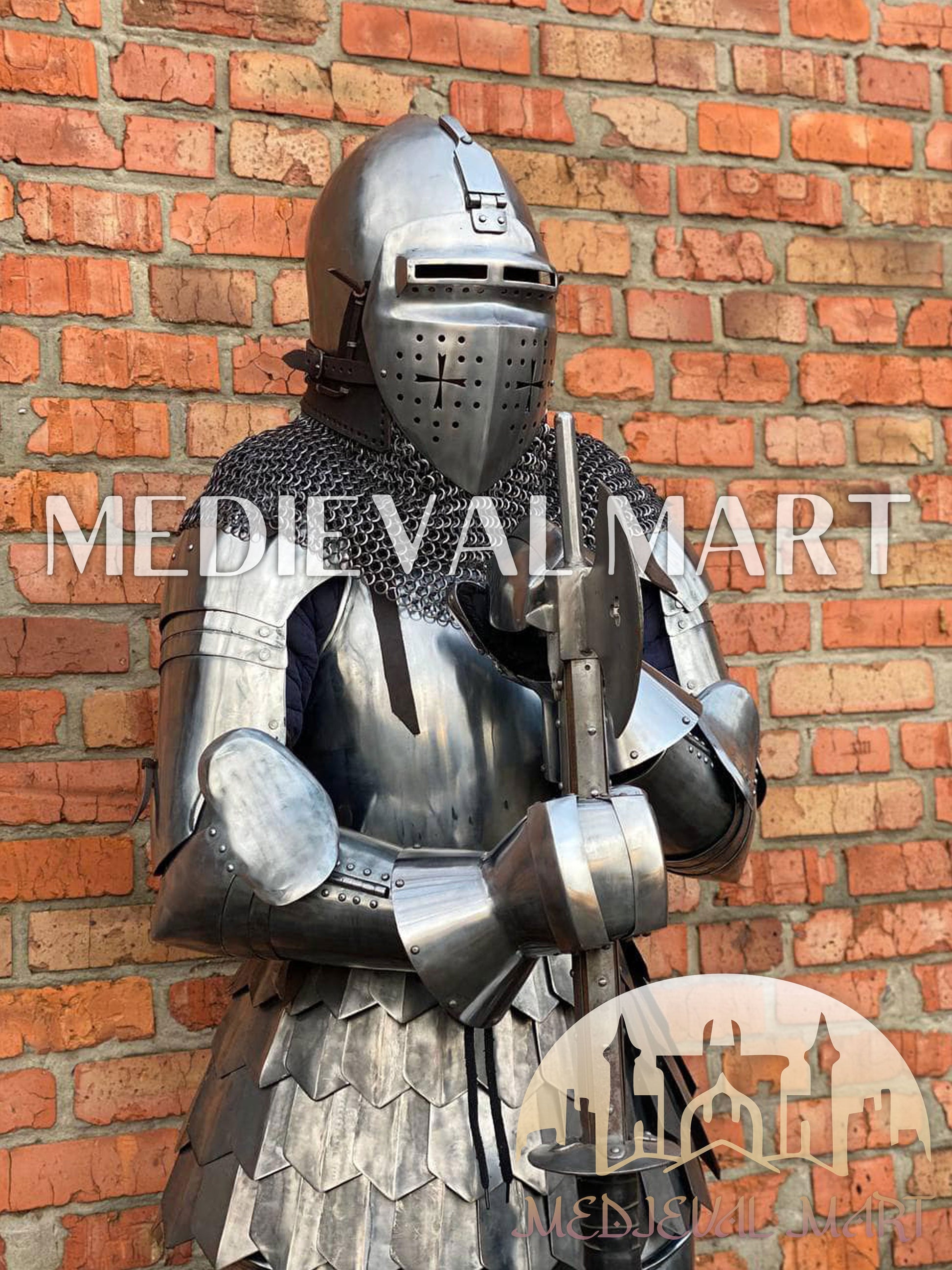 This transitional armor reflects the evolution of medieval warfare, where flexibility met fortification. Each component — from the mail-and-plate torso to the fully functional bacinet — is handcrafted for performance and authenticity.