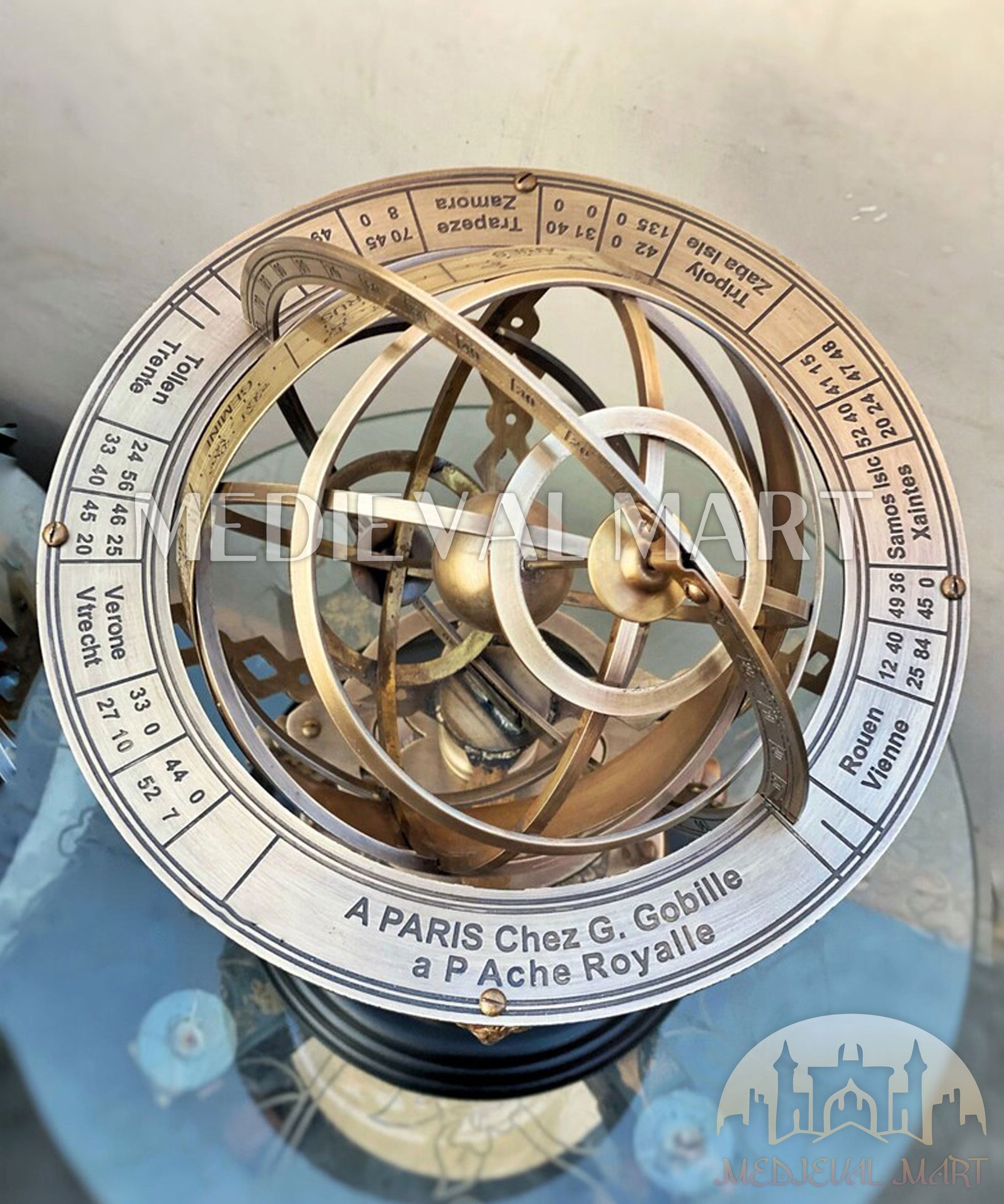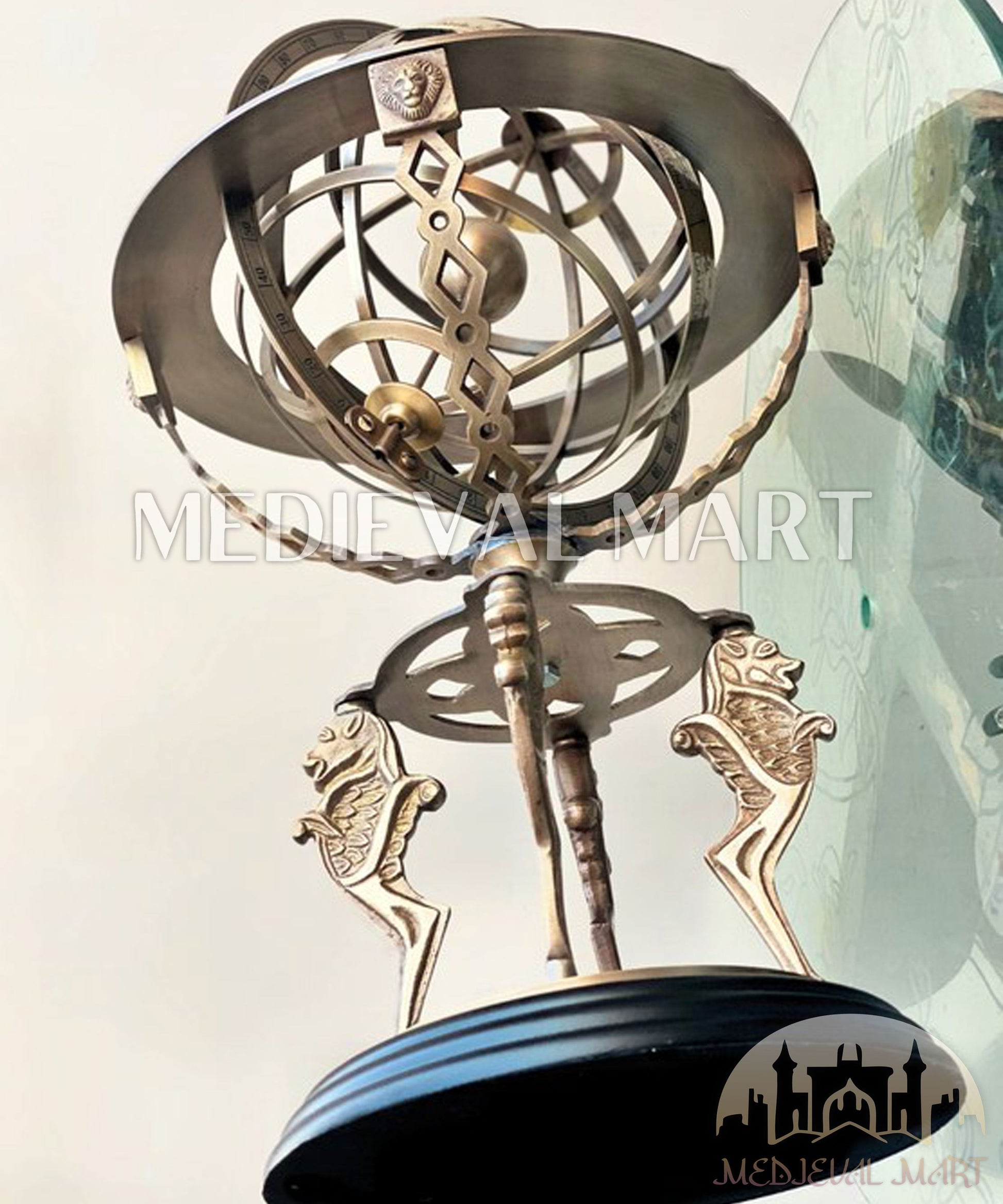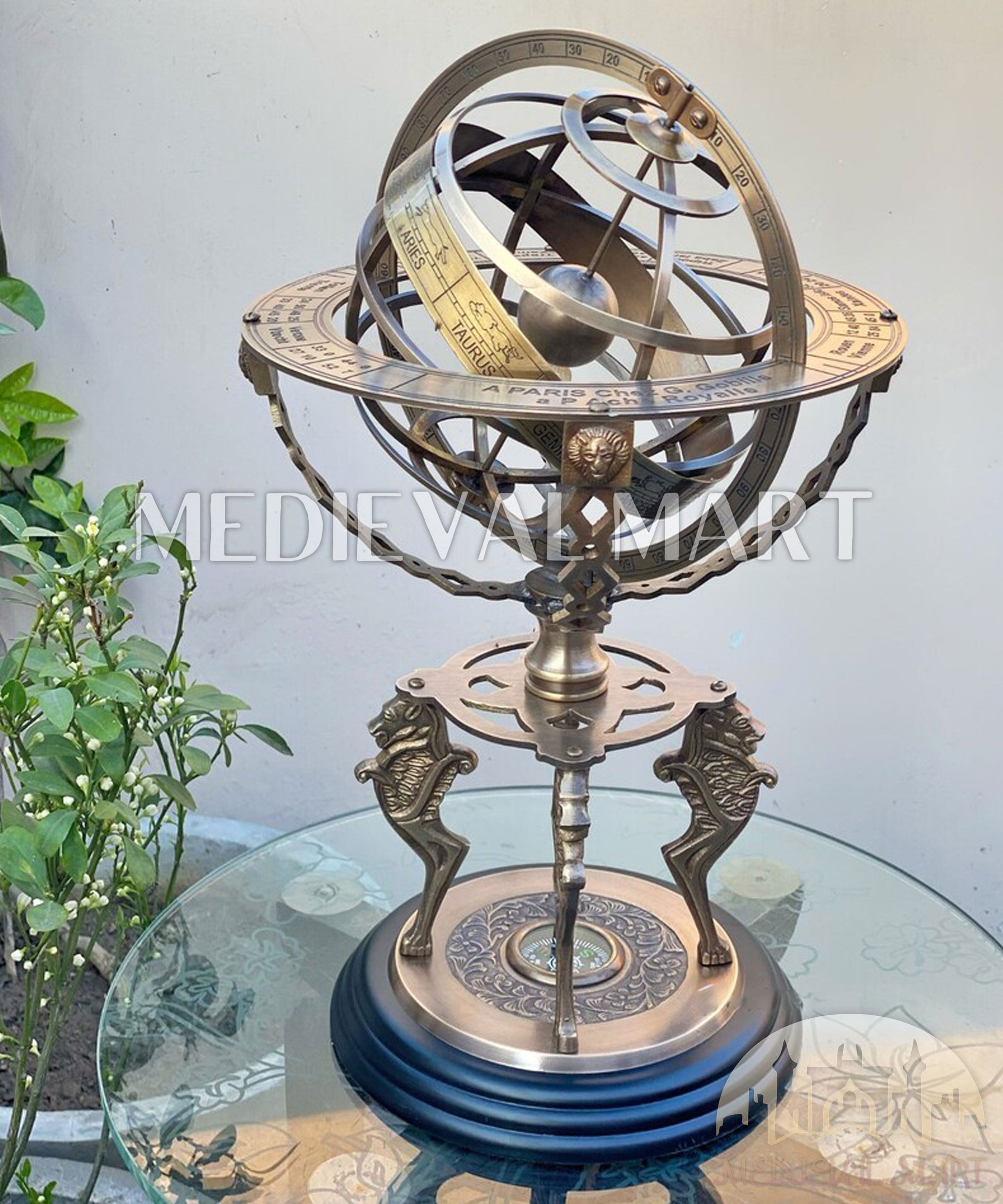 Elevate your space with this Luxury Antique Brass Armillary Sphere Globe, a timeless reproduction of the classical celestial models once used by scholars to explore the heavens. Meticulously handcrafted in solid brass with engraved zodiac signs and celestial markings, this piece rests on an ornate stand with a built-in compass, making it both decorative and symbolic.