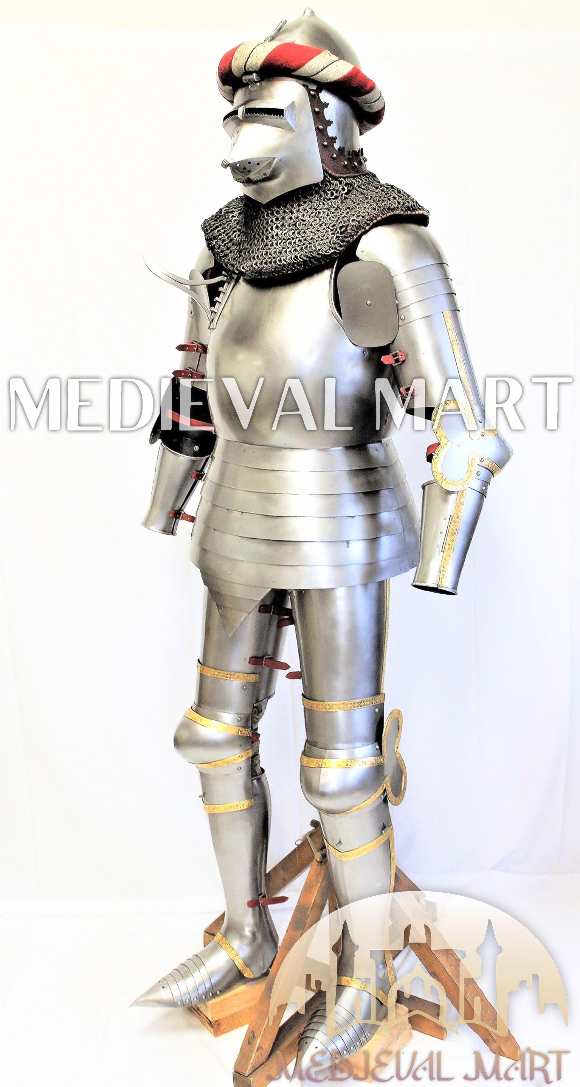 This full suit, forged in tempered steel, includes articulated plates for flexible movement in battle and reenactments. From the gothic-style breastplate to detailed greaves and gauntlets, every piece reflects the essence of medieval warfare — noble, rugged, and commanding.