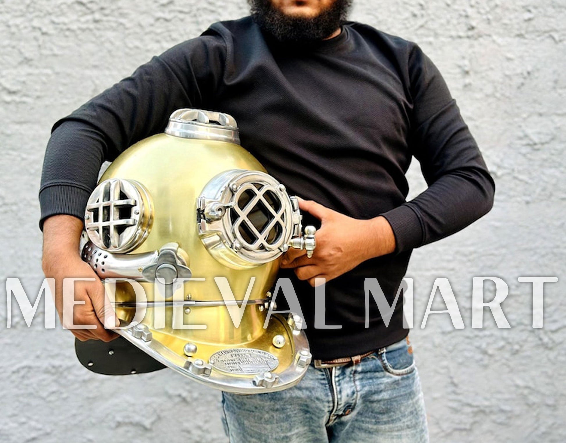 The Golden Green Diving Helmet is a stunning blend of antique charm and modern craftsmanship. Featuring a unique golden green finish, this replica captures the essence of vintage deep-sea exploration. Handcrafted with intricate detailing, it’s perfect for collectors, maritime enthusiasts, or as a standout piece in nautical-themed decor.