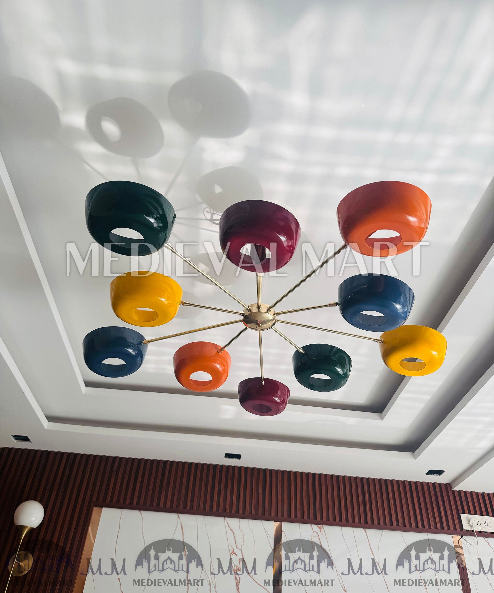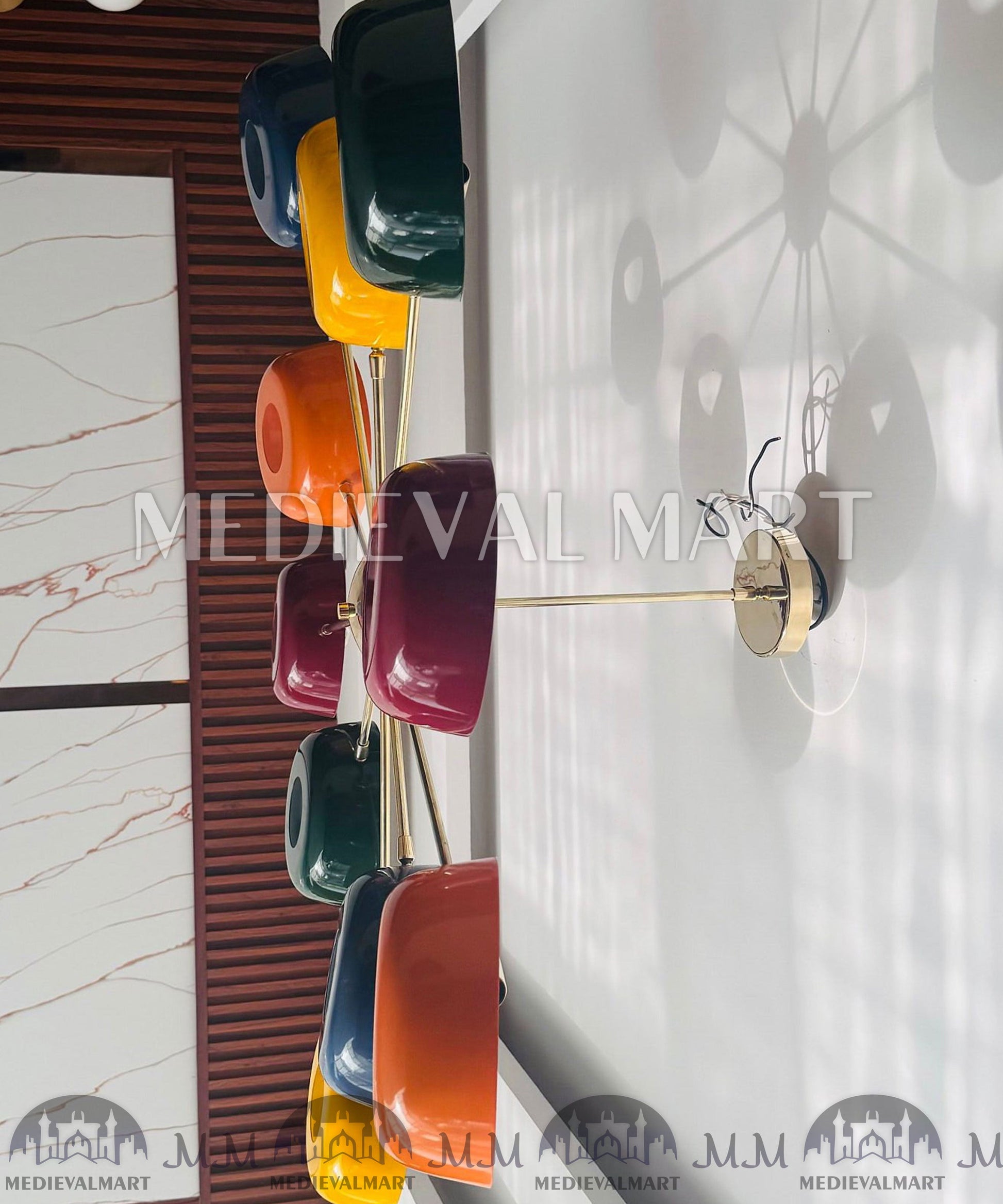 Featuring a radiant starburst structure with multi-colored glass shades, each chandelier is a true statement piece that illuminates any interior with warmth and sophistication. Perfect for living rooms, dining areas, or creative studios, this light fixture adds both artistic flair and functional beauty.