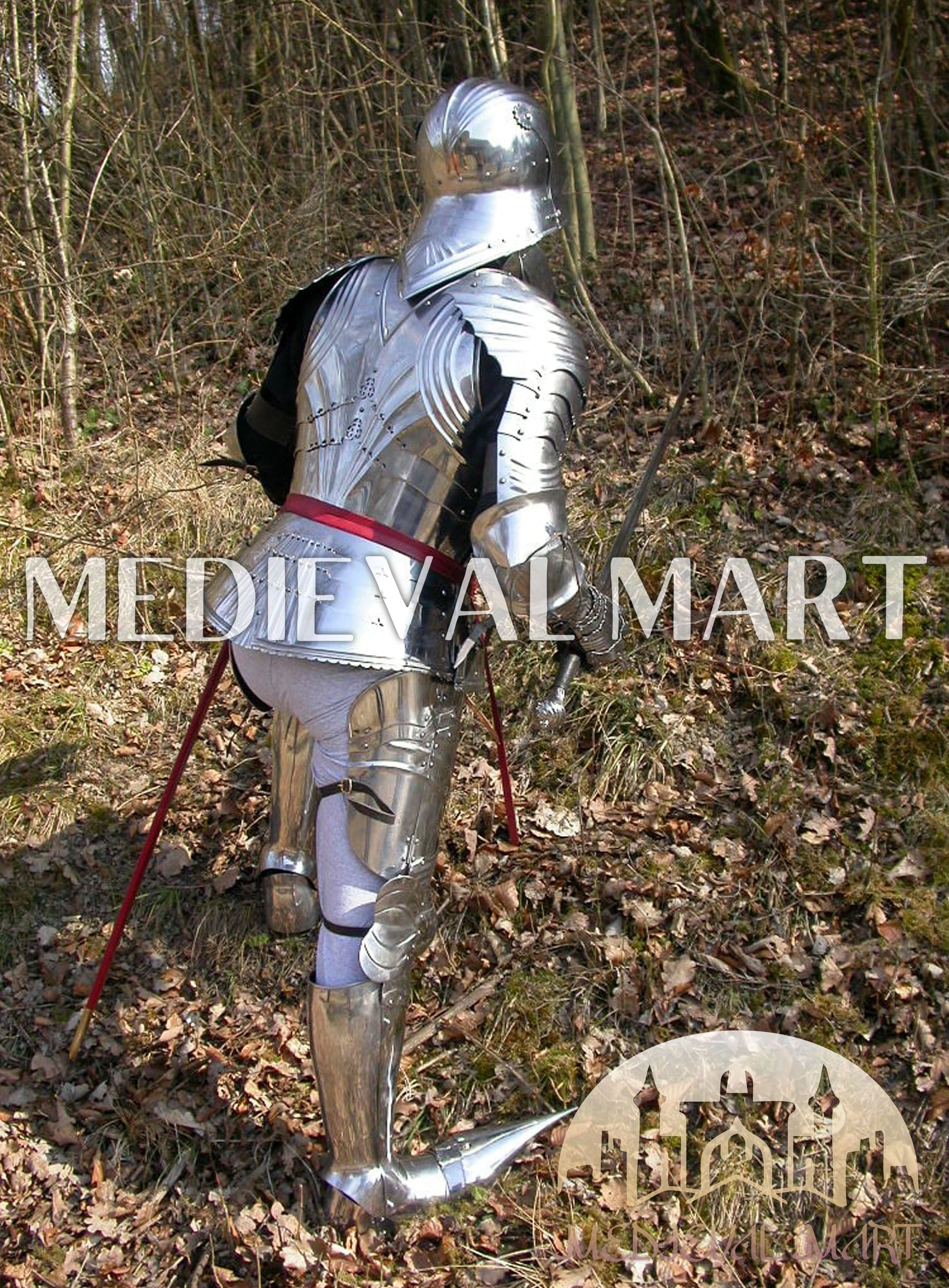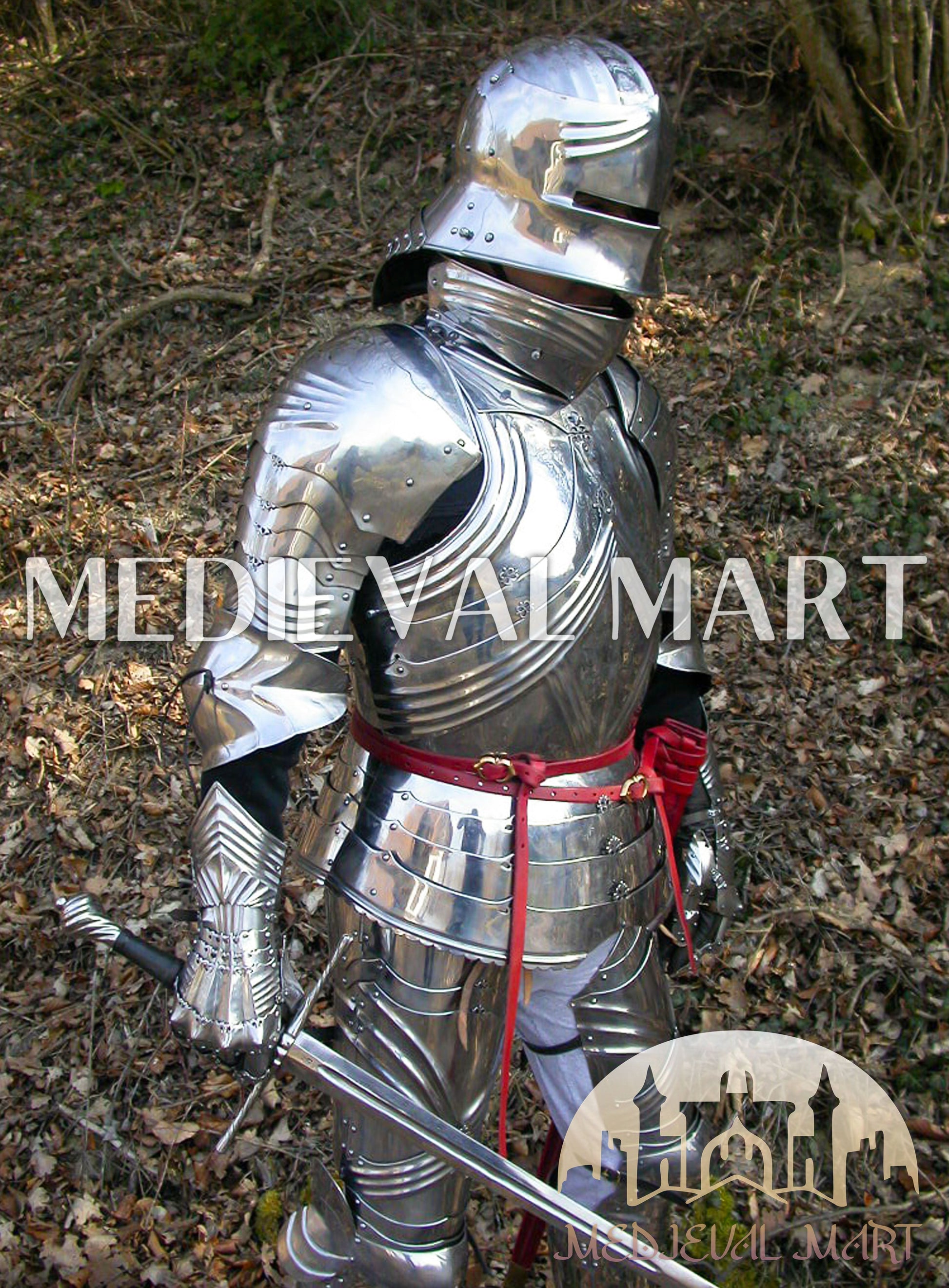 MEDIEVALMART’s 15th Century German Knight Warrior Full Body Armor Set, featuring complete metal protection, a hand-forged sword, and chainmail innerwear. This historically inspired armor captures the valor and craftsmanship of real medieval knights — making it ideal for reenactments, cosplay, themed décor, or as a legendary gift for Dad.