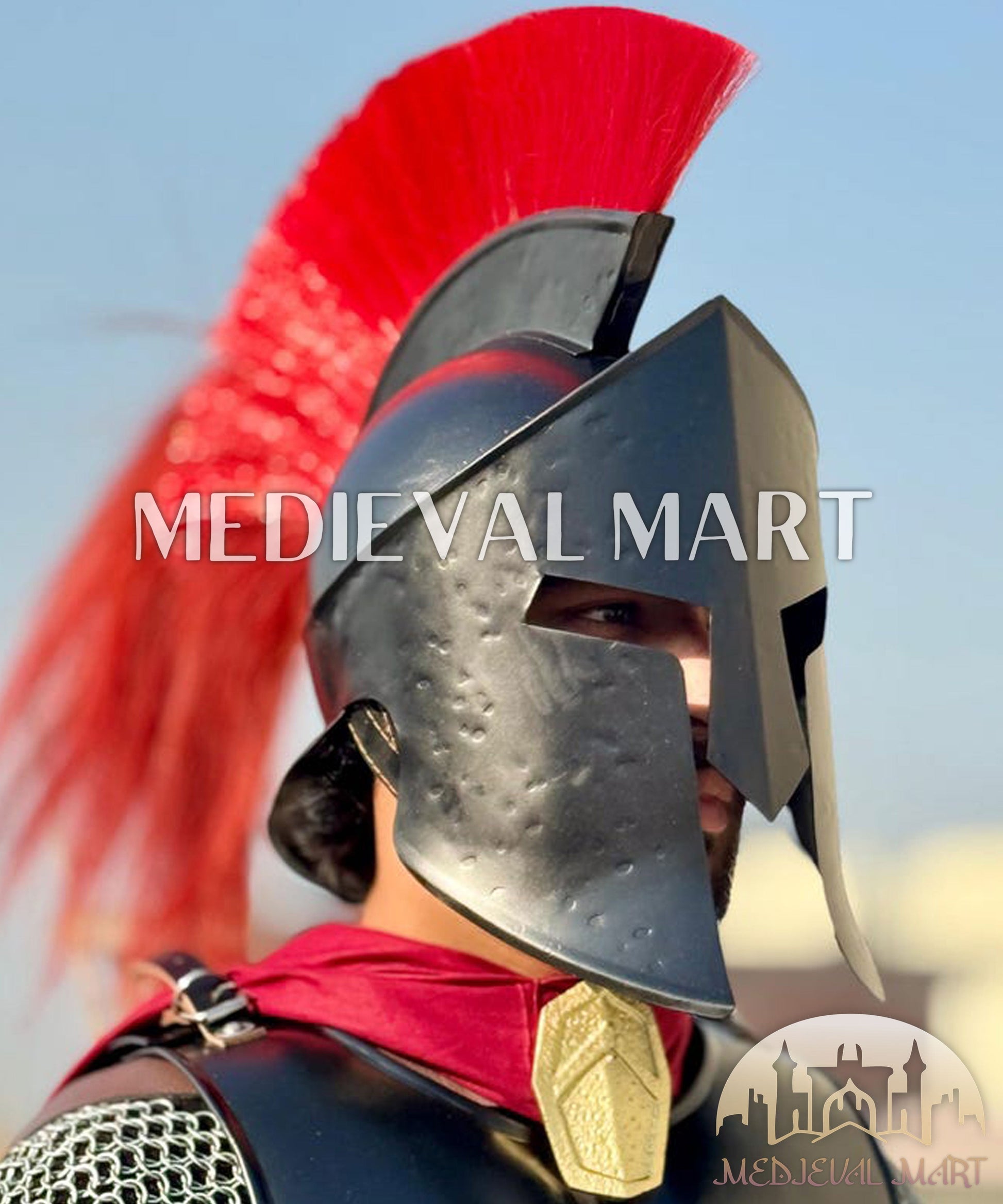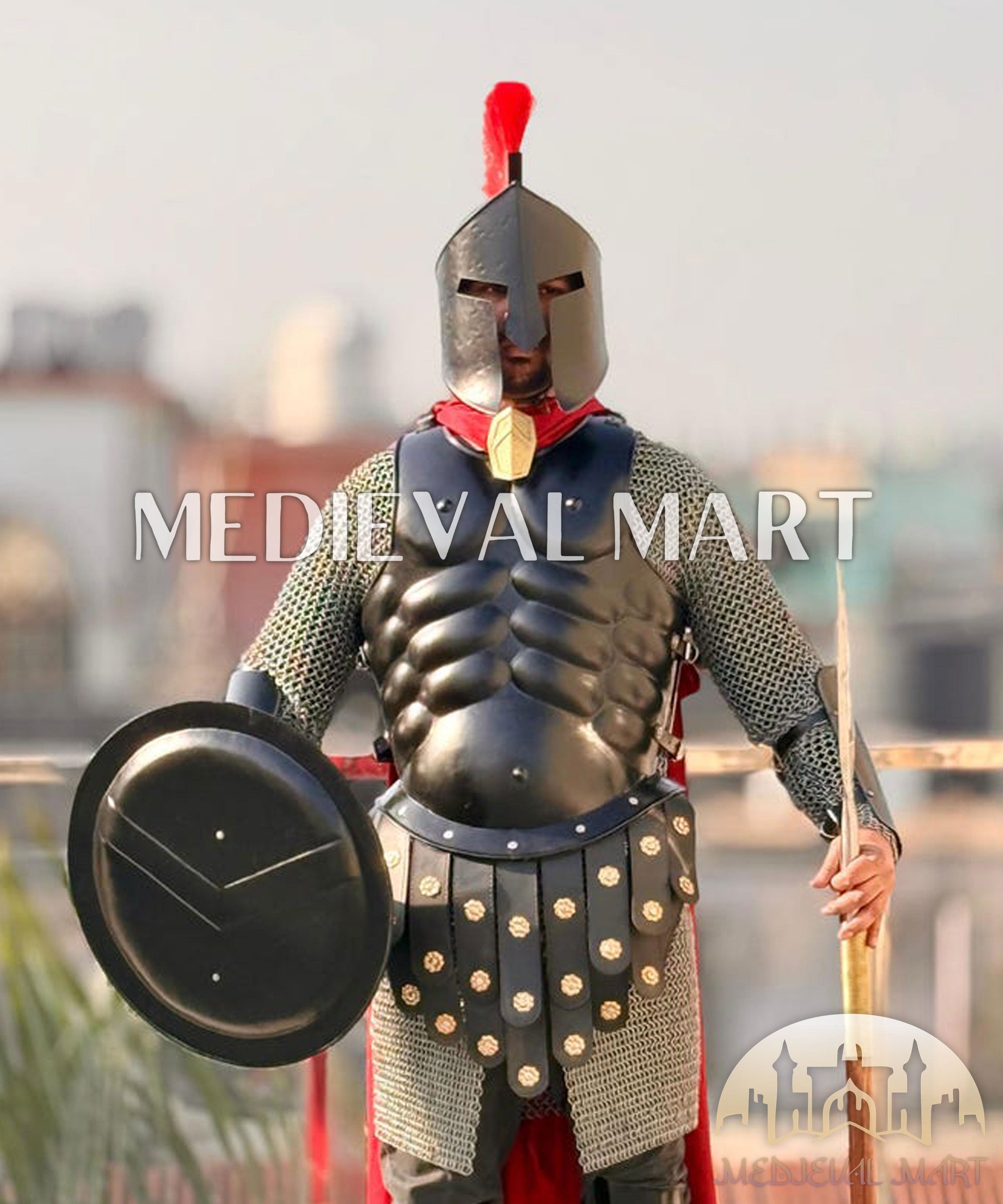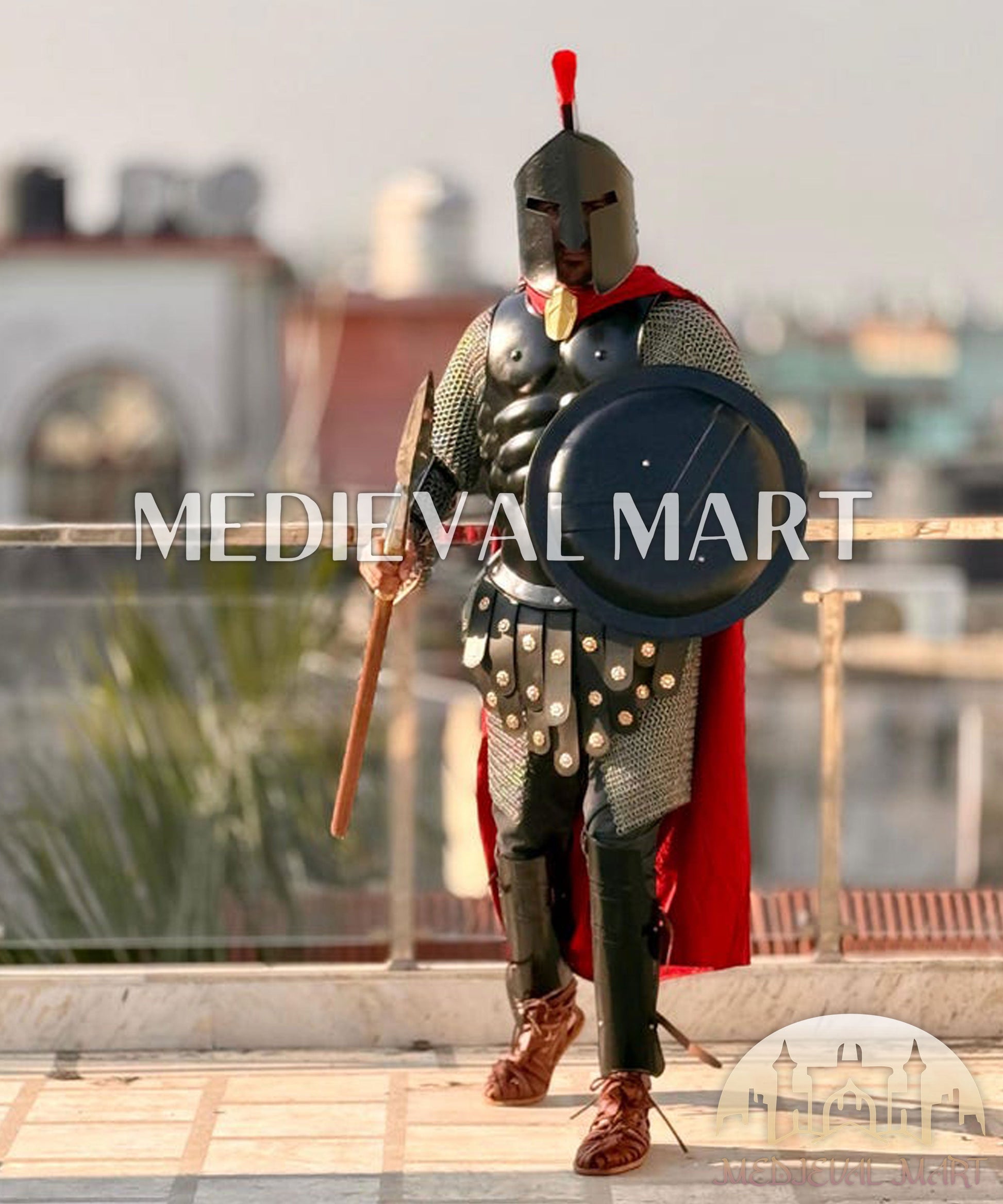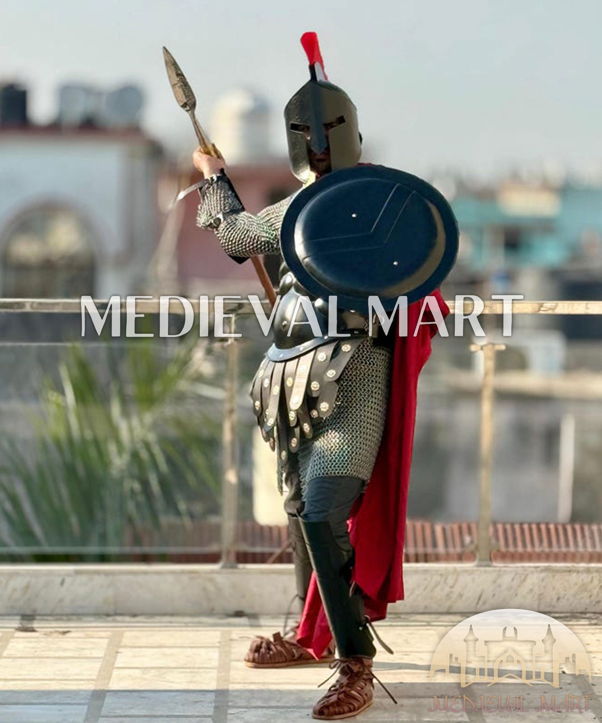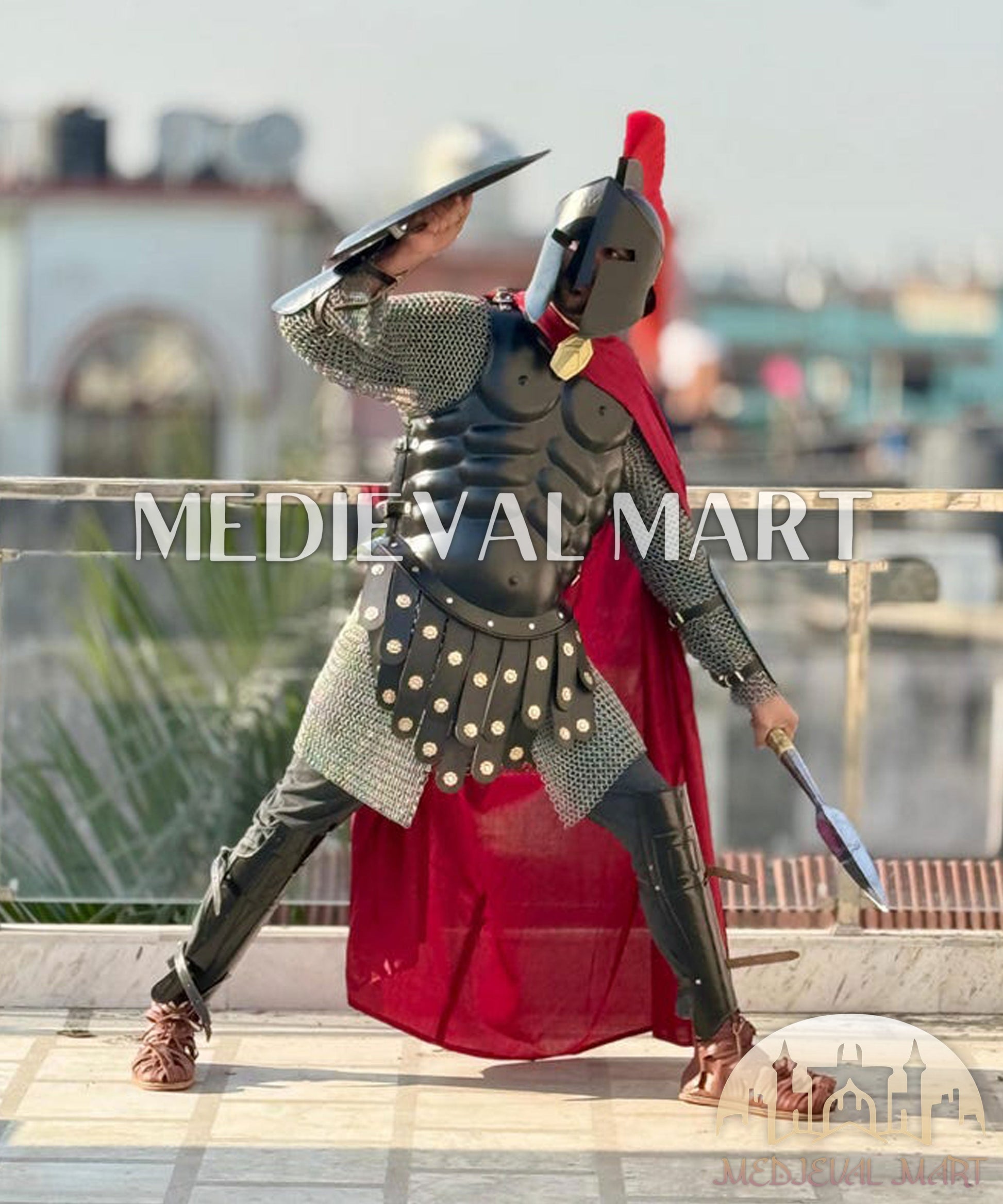 The Medieval Black Knight Steel Greek 300 Spartan King Leonidas Full Costume is a stunning tribute to the legendary warrior king of Sparta. Crafted from high-quality steel, this full armor set features a bold black finish, evoking the power and resilience of the Spartans. It includes a helmet, cuirass, pauldrons, bracers, greaves, and a signature Spartan cape, ensuring an authentic and battle-ready look. Designed for LARP, cosplay, reenactments, or collectors, this suit offers both durability and comfort with adjustable leather straps. Command the battlefield like King Leonidas himself with this legendary armor from Medieval Mart.