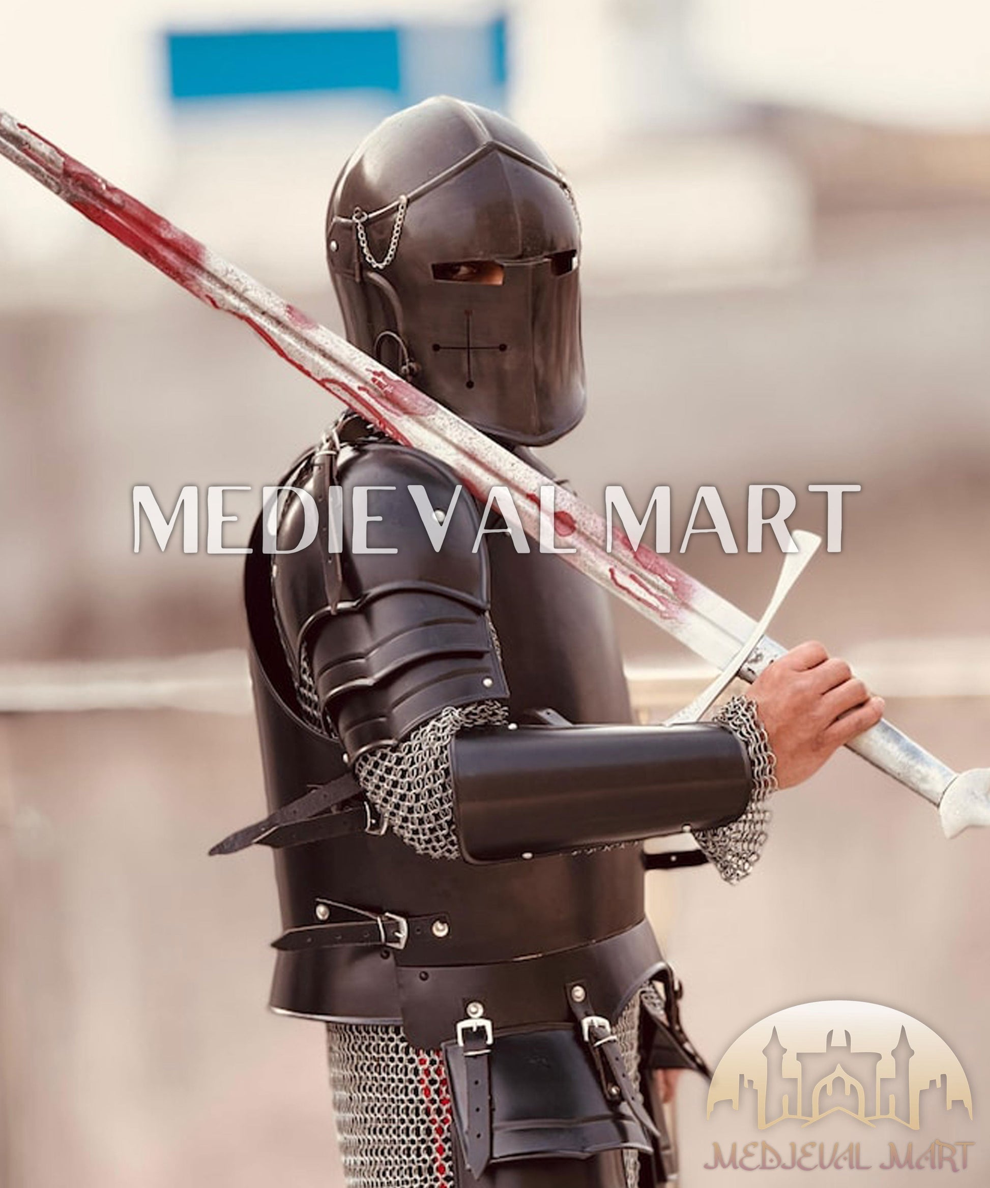 The Medieval Dark Drake Black Templar Barbute Knight Armor Suit is a masterpiece of historical craftsmanship, designed for warriors who seek both protection and presence. Made from high-quality steel with a striking blackened finish, this suit includes a Barbute helmet, breastplate, pauldrons, and greaves, embodying the strength of medieval Templar knights. Its bold, battle-ready aesthetic makes it ideal for LARP, reenactments, cosplay, or display. The intricate detailing and superior durability ensure it stands the test of time. Medieval Mart brings you this finely crafted armor, perfect for collectors and enthusiasts looking to own a piece of Templar history.