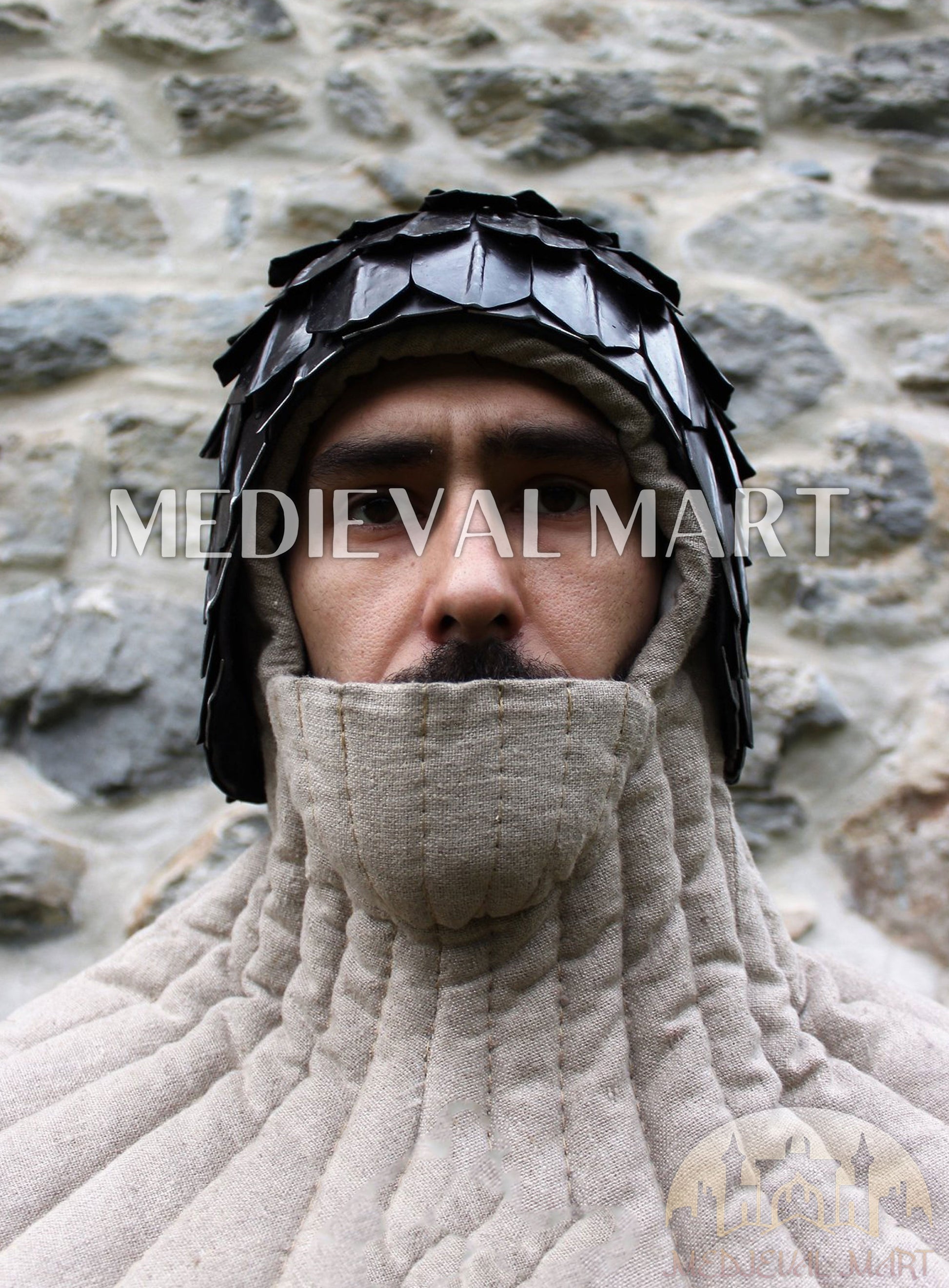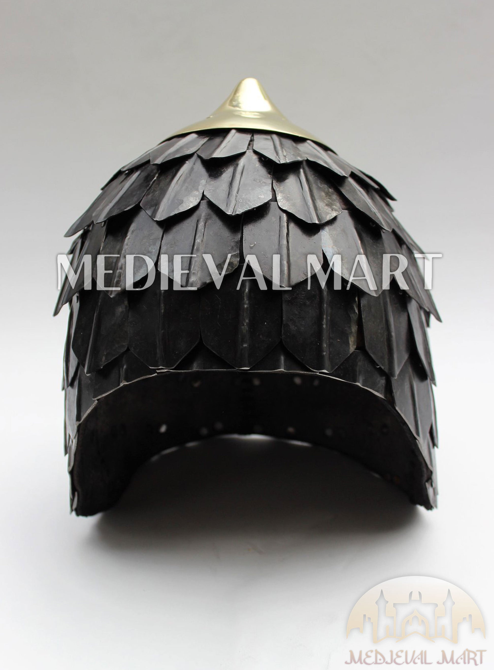 Hand-forged with precision and finished in a rich antique black polish, the helmet reflects both rugged authenticity and historic charm. The overlapping scale plates around the crown provide enhanced durability and shock resistance, making this helmet a reliable piece for reenactors, collectors, and LARP warriors alike.