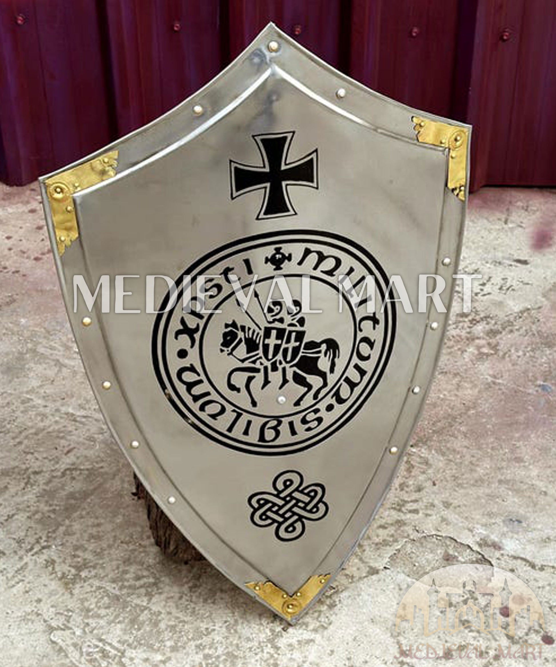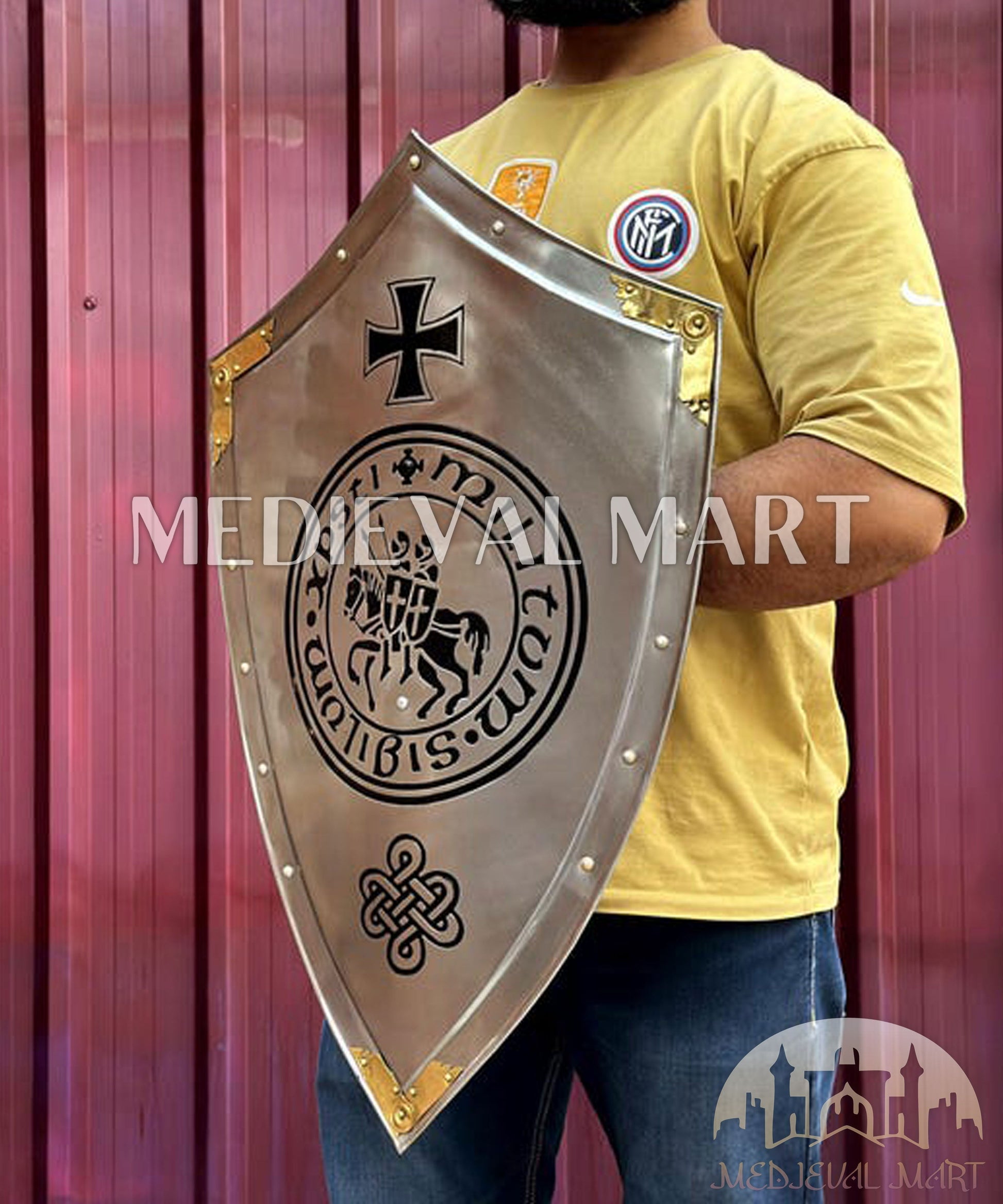 Honor medieval tradition with MEDIEVALMART’s Iconic Templar Knight Crusader Cross Shield, designed with a classic cross and elegant brass detailing. A symbol of courage and faith, this shield is ideal for cosplay, reenactments, or wall décor, and makes a meaningful gift for Dad. Finished with a bold medieval design and a subtle metallic touch, this shield adds historical depth and character to any collection or display. Whether for a knight-themed room or a proud collector, it's a standout piece of heritage and strength.