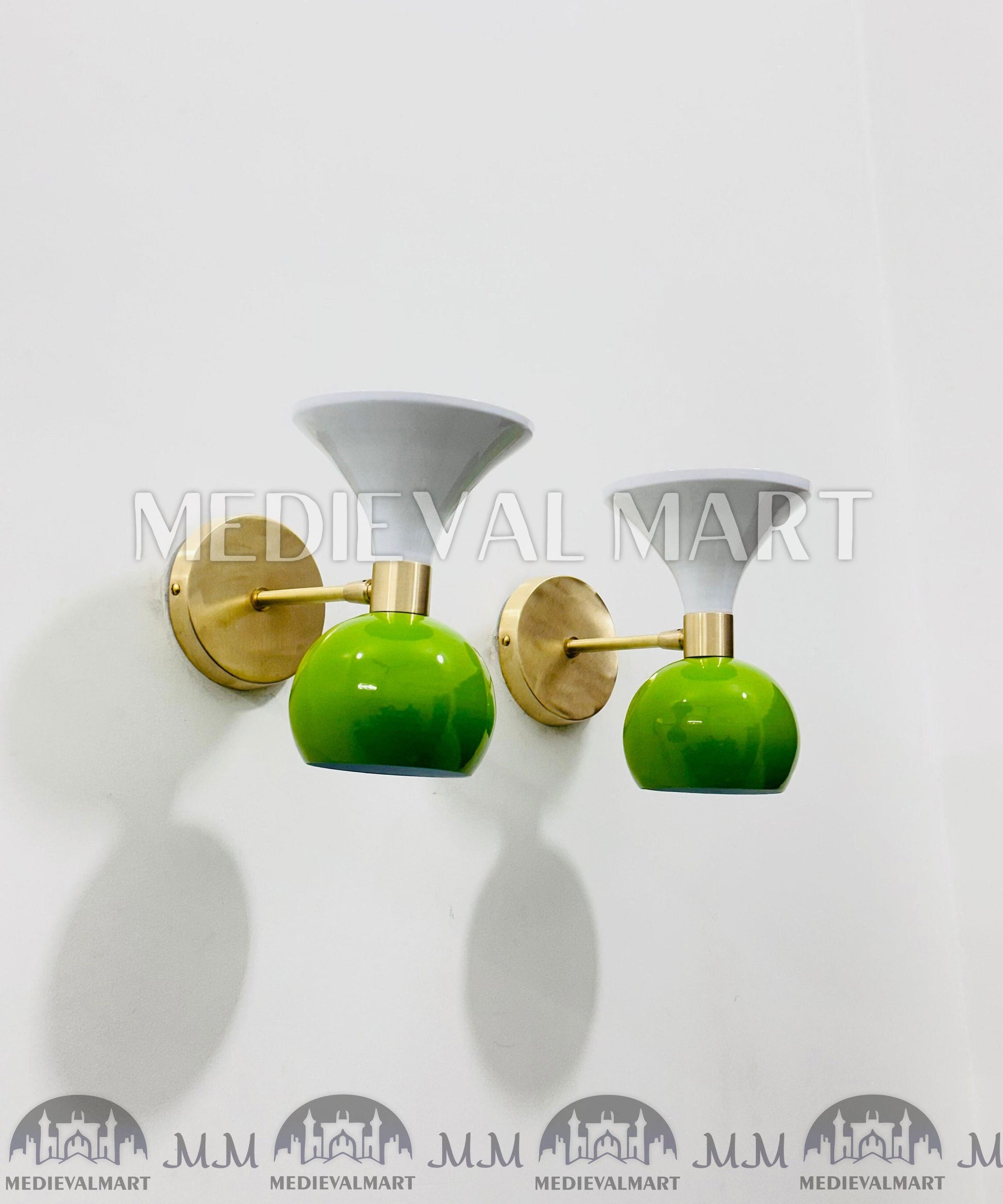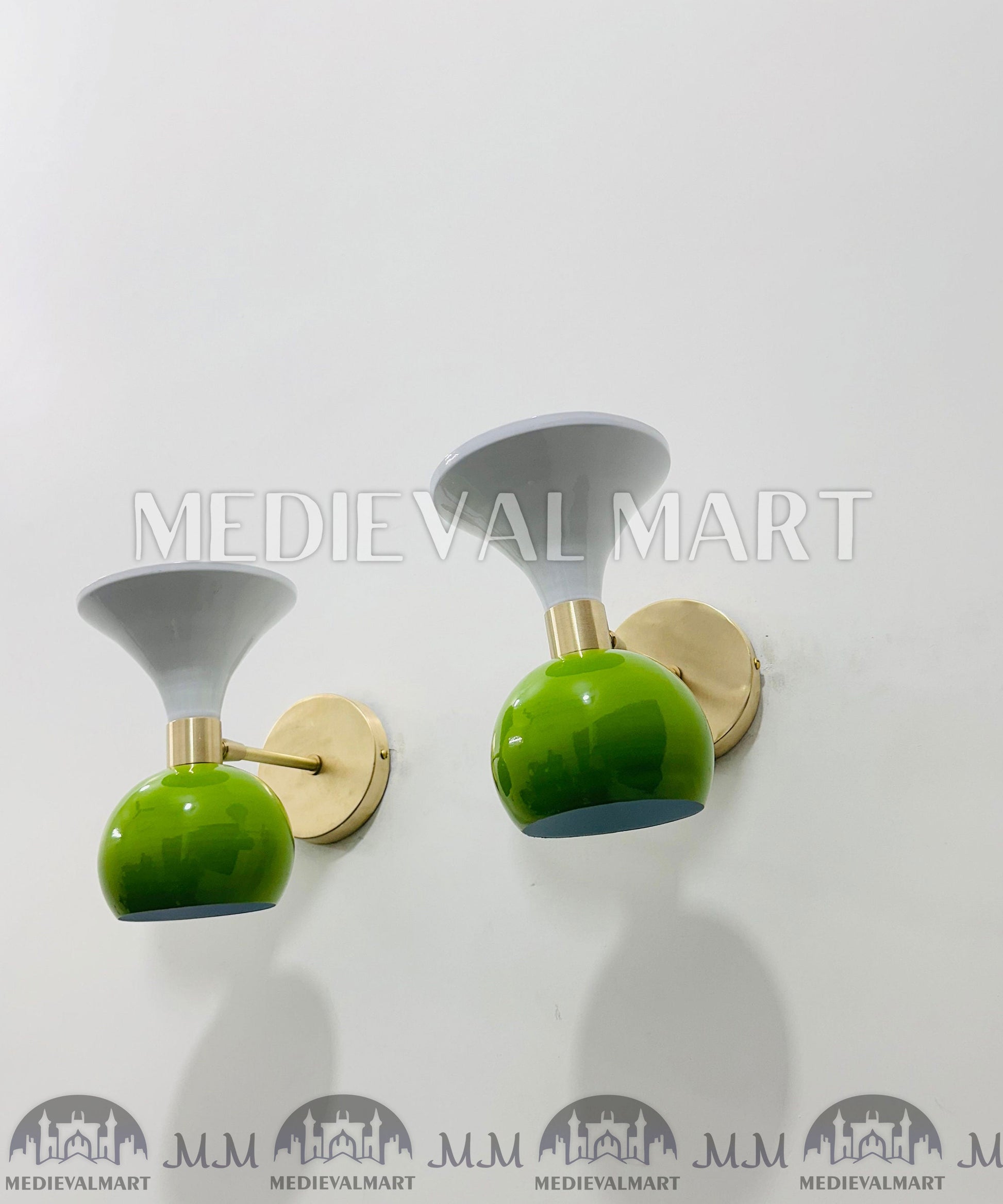 Bring refined mid-century charm to your interiors with the MEDIEVALMART Mid-Century Modern Brass Diabolo Wall Sconce Pair. Finished in elegant green and white enamel, these handcrafted fixtures combine Italian Diabolo design with timeless brass craftsmanship.