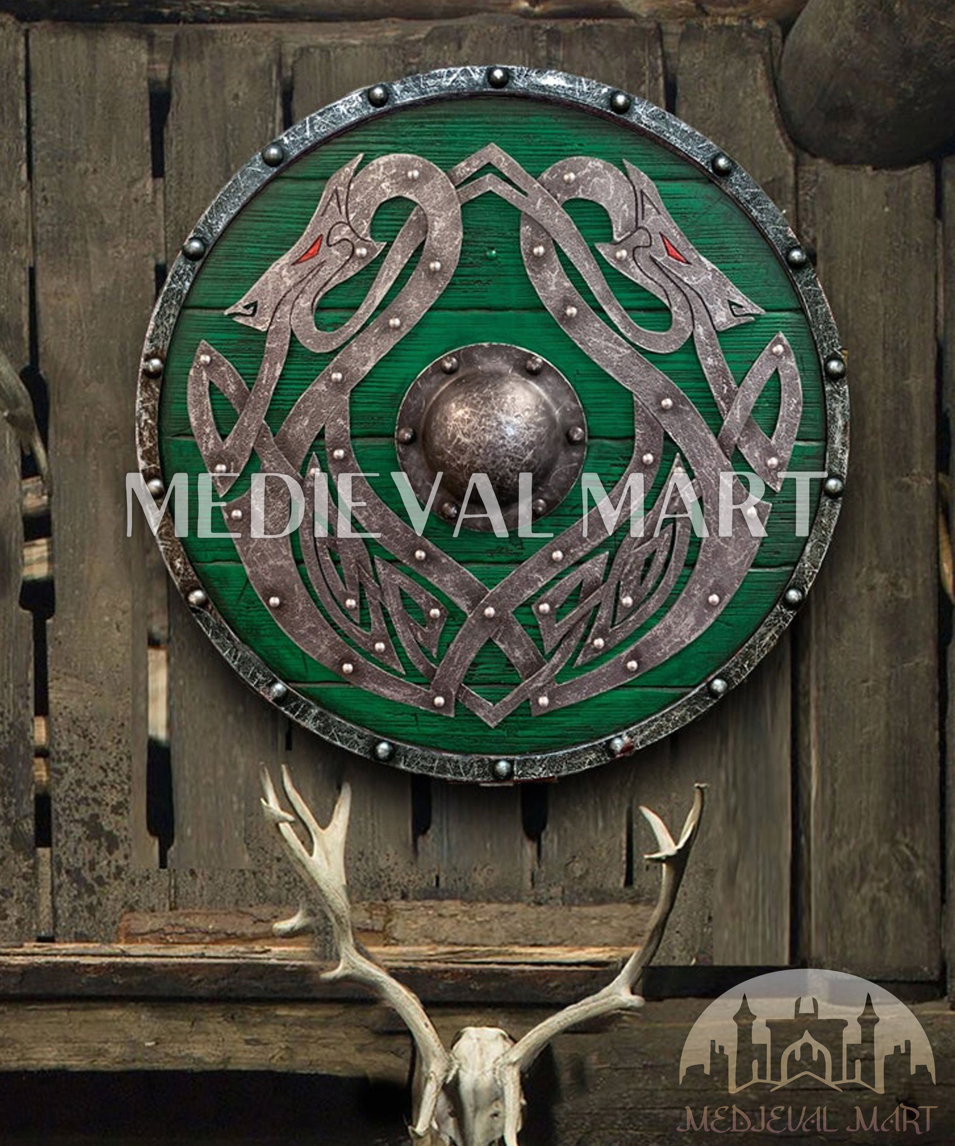 Unleash the power of the legendary sea serpent with the MEDIEVALMART Valhalla GREEN Sea Dragon Jörmungandr Authentic Battleworn Viking Wooden Shield. Inspired by Jörmungandr, the mythical world serpent from Norse mythology, this shield symbolizes the immense strength and unyielding power of one of the most feared creatures in Viking lore.