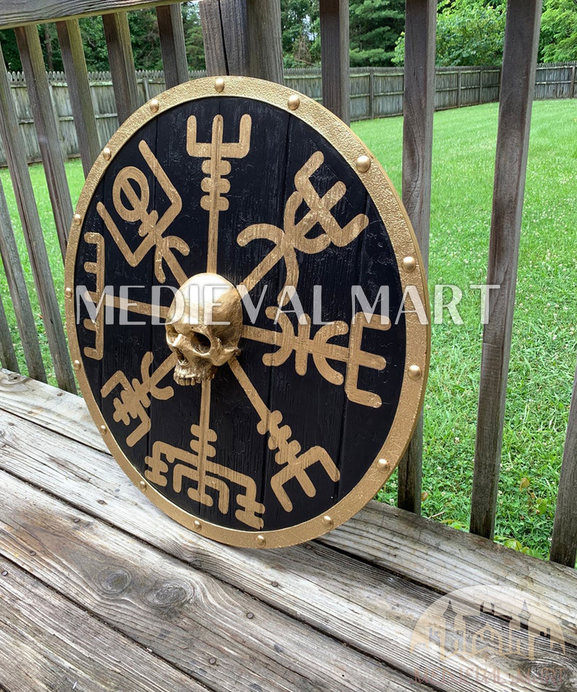 Discover the power and symbolism of Viking tradition with the MEDIEVALMART Viking's Iconic Vegvisir Skull and Compass Battleworn Viking Wooden Shield. This stunning shield merges two legendary Viking symbols: the Vegvisir, known as the "Viking compass," and the Skull, symbolizing strength and resilience in battle.