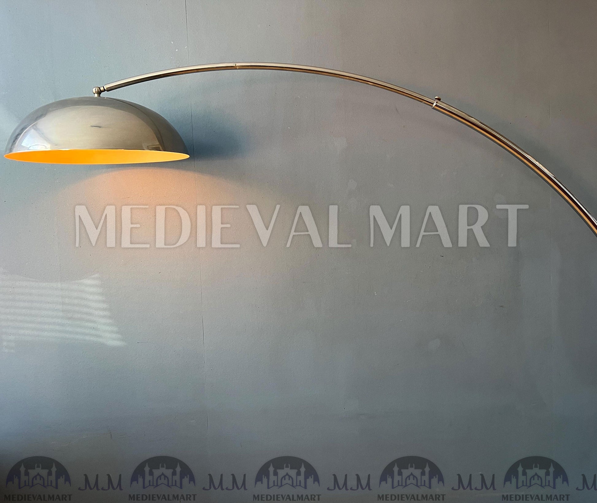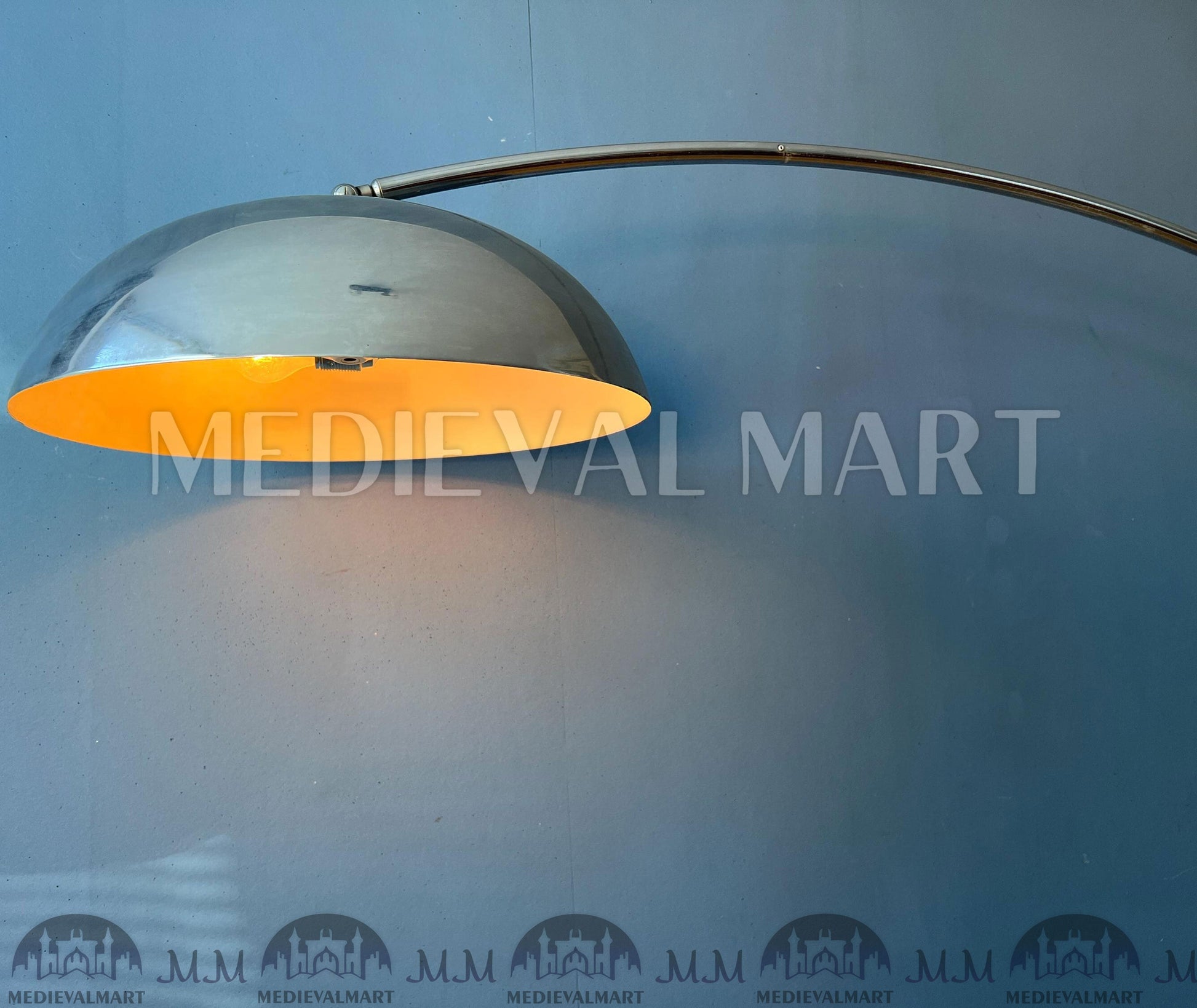 Elevate your interior with the MEDIEVALMART Vintage Italian Space Age Arc Floor Lamp, a striking example of 1970s modernist design. This lamp showcases a curved chrome arc paired with a sleek metallic dome shade, reflecting the innovative spirit of Italian Space Age lighting. Its sculptural form combines elegance and utility, casting a warm and focused light ideal for living rooms, reading spaces, or minimalist studios.