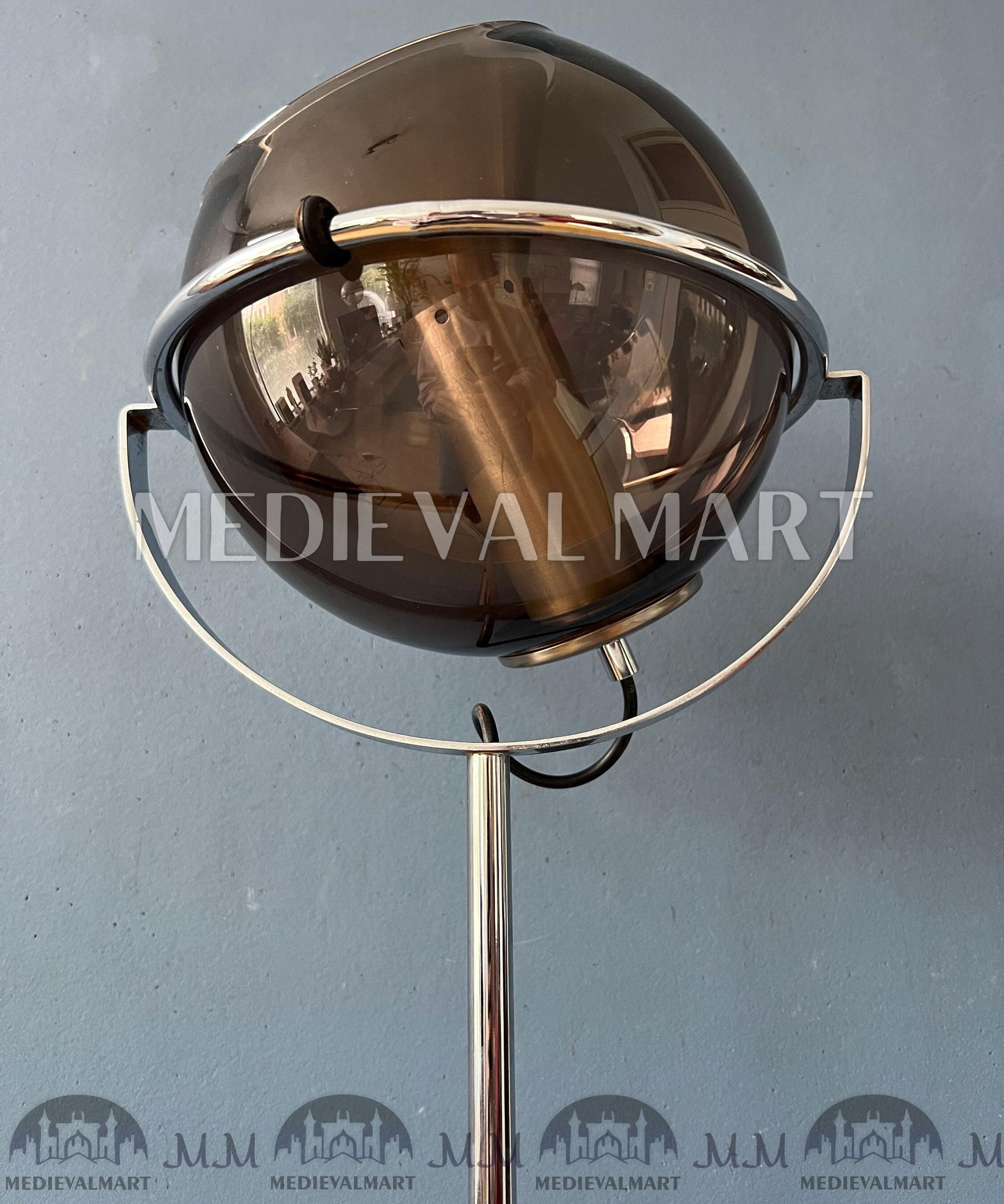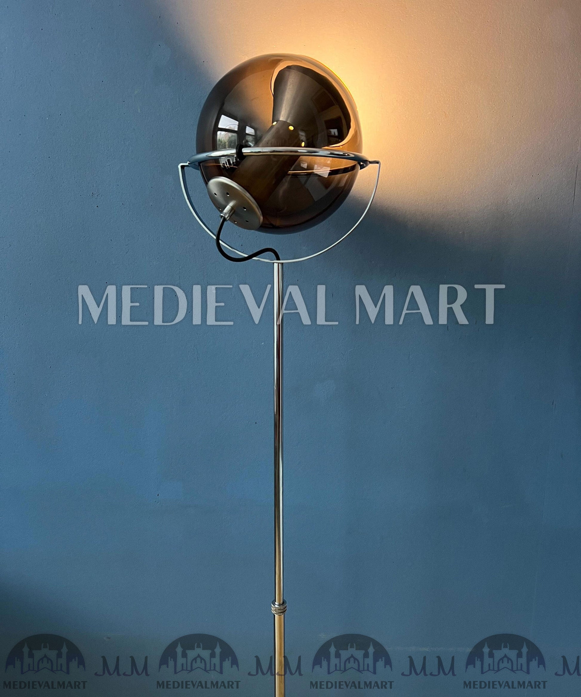 Experience the brilliance of Dutch modern design with the MEDIEVALMART Vintage Raak Space Age Globe Eyeball Floor Lamp, originally created by the renowned designer Frank Ligtelijn for Raak Amsterdam in the late 1960s. This striking lamp captures the essence of Space Age futurism, featuring a smoked glass globe diffuser elegantly balanced on a polished chrome stand.