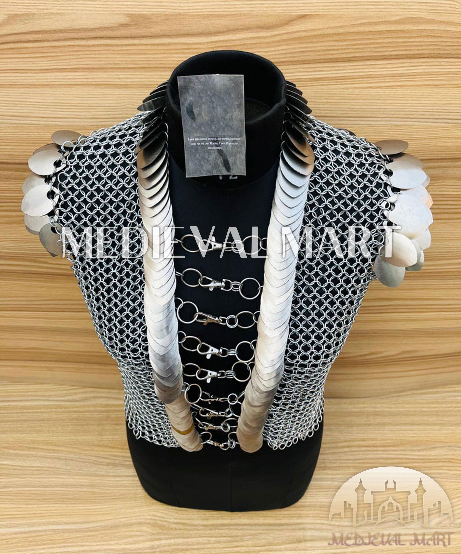 The MedievalMart Women’s Darkstar Chainmail Plate Armor is a masterful fusion of strength, style, and historical craftsmanship. Designed for fierce female warriors, this armor features sturdy plate segments reinforced with chainmail, offering both protection and flexibility in battle or cosplay. The dark, battle-worn finish adds a mystical and formidable aura, making it perfect for LARP, SCA combat, medieval reenactments, or fantasy events. With a design that balances mobility and resilience, this armor is ideal for warriors, knights, or adventurers who seek an authentic and commanding presence on the battlefield. Dominate the realm with the Darkstar Chainmail Plate Armor!