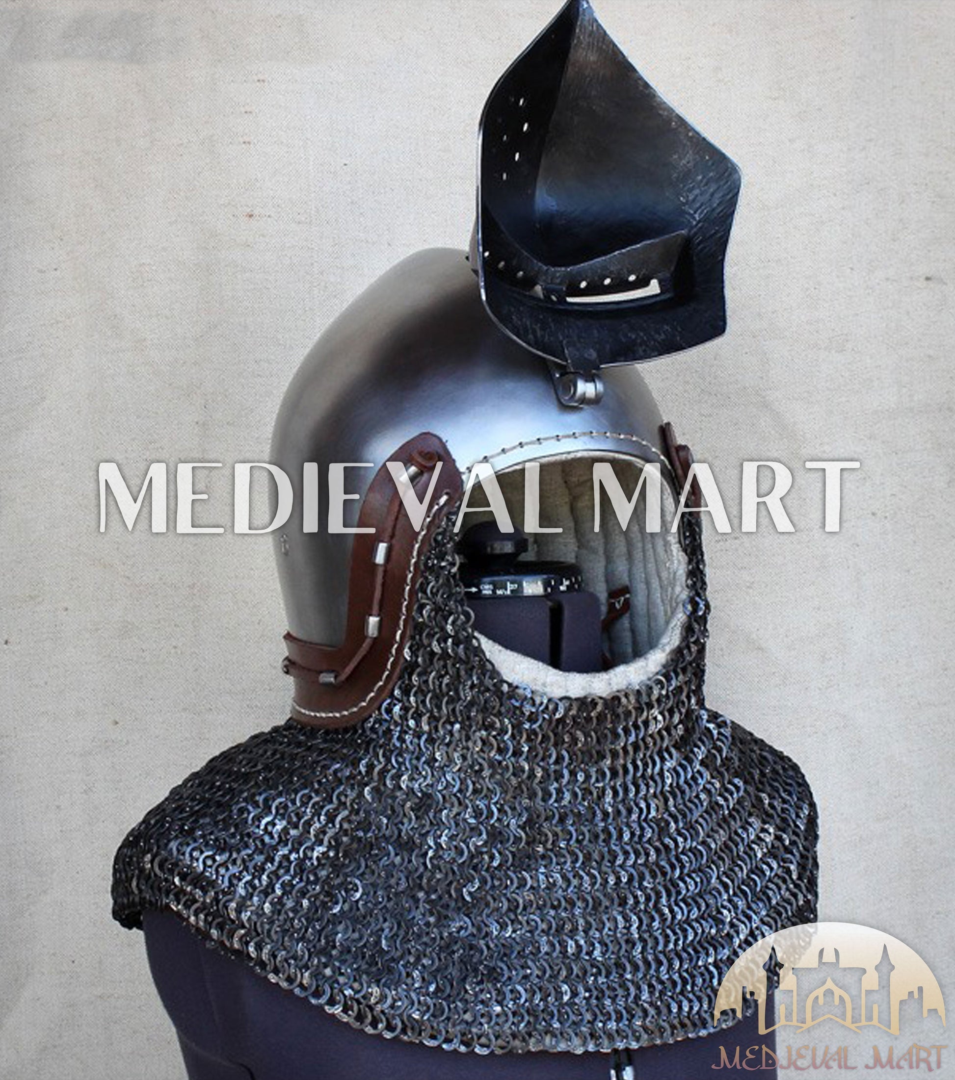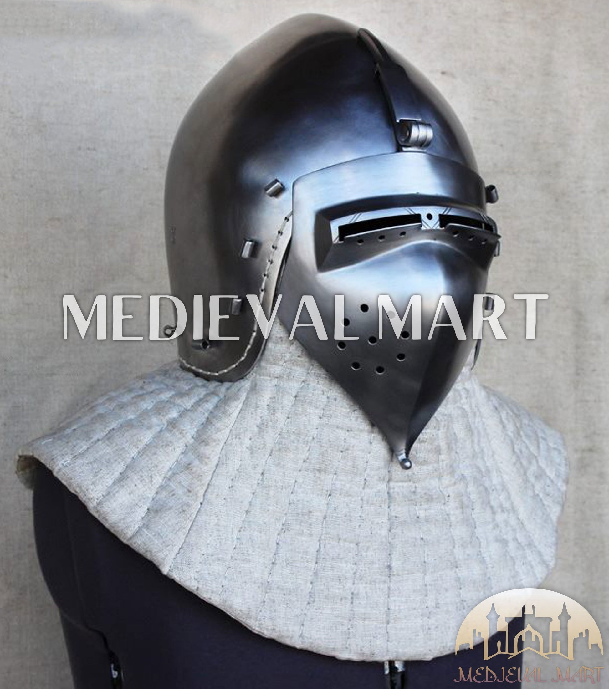 The MEDIEVALMART 14th-Century “The Wayward Knight” Klappvisor Bascinet Helmet, inspired by the transitional Gothic era of medieval warfare. This helmet features a movable klappvisor (hinged visor) — a signature innovation of 1300s battlefield armor, combining face protection with field visibility.